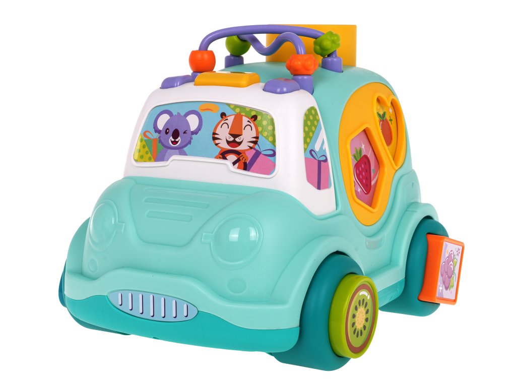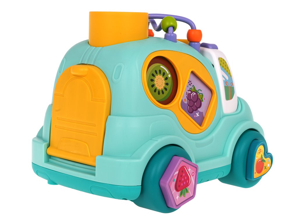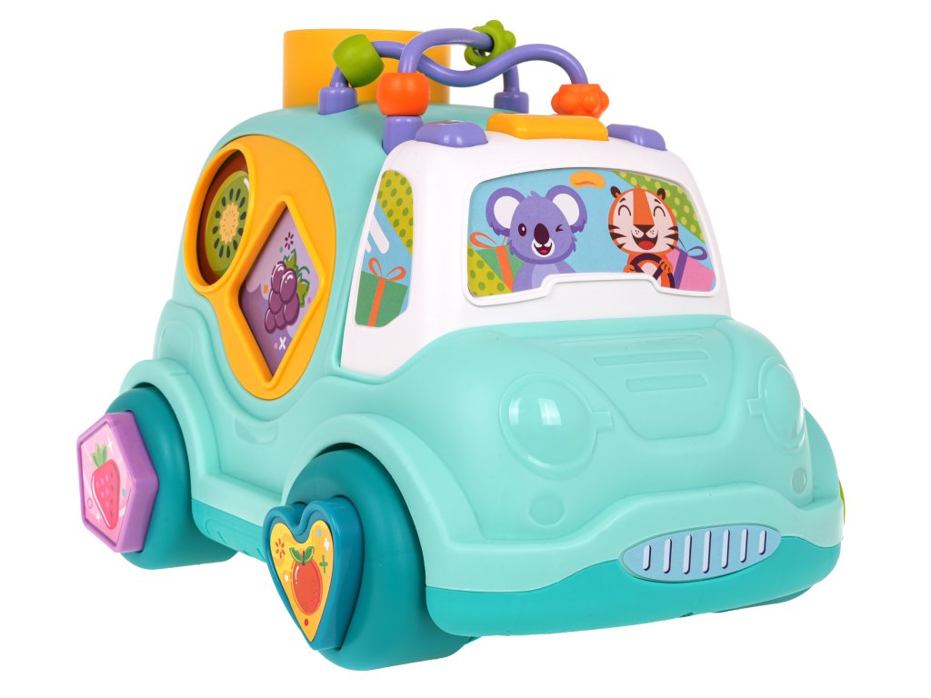 Interactive bus with sorter, sound effects and light for children over 18 months of age. The bus has a shape sorter on the sides and on the wheels. The set includes 4 blocks to match. On the roof there is an inlet for hitting balls with a hammer into the vehicle (hammer and balls included). The balls have rattles inside. There is also a bead changer at the inlet. We can remove the balls from the vehicle by opening the rear flap of the vehicle. At the top of the windshield there is a button that activates sound effects such as the sounds of starting the vehicle, horn or cheerful melodies. The sound effects are accompanied by flashing lights. The toy is powered by 2 x AA 1.5 V batteries (not included).