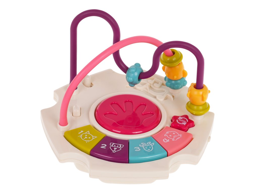 At the top of the box there is a colorful intertwining with sensory beads, a switch with two-stage volume control, a red drum with a picture of a hand, four buttons with animal sounds (dog, cat, sheep or duck) or melodies depending on the mode. A red button with a star that activates 4 different piano modes.