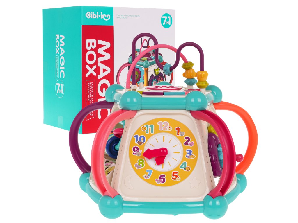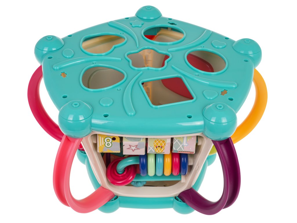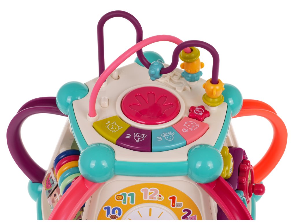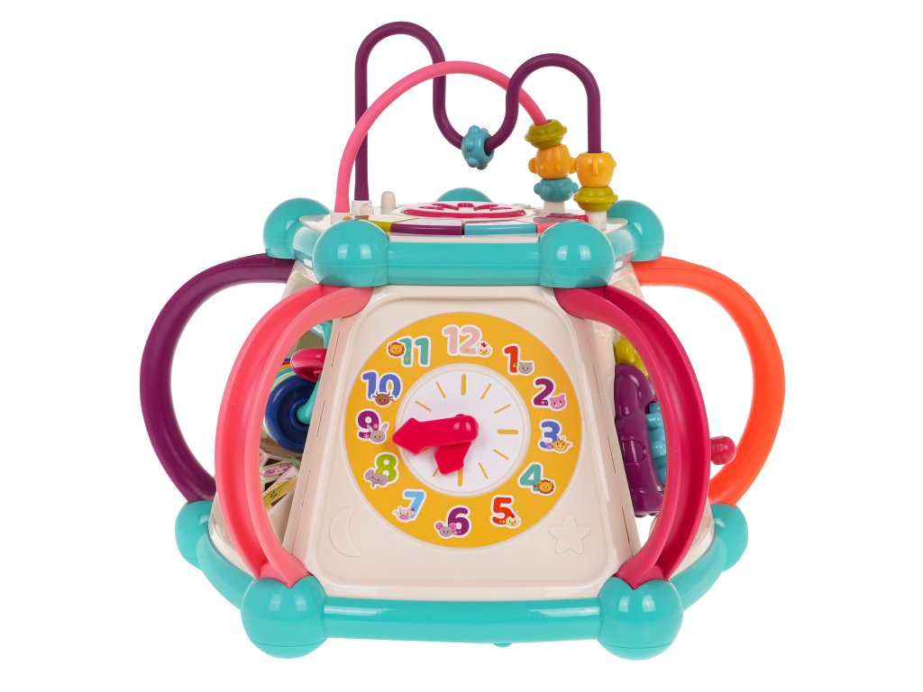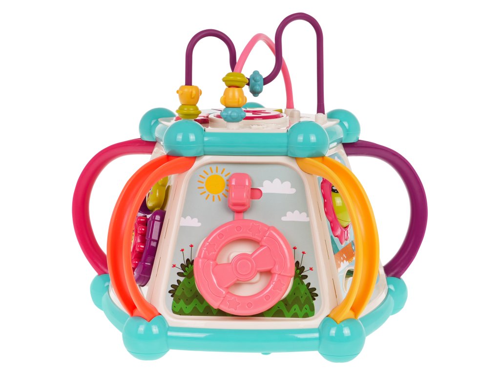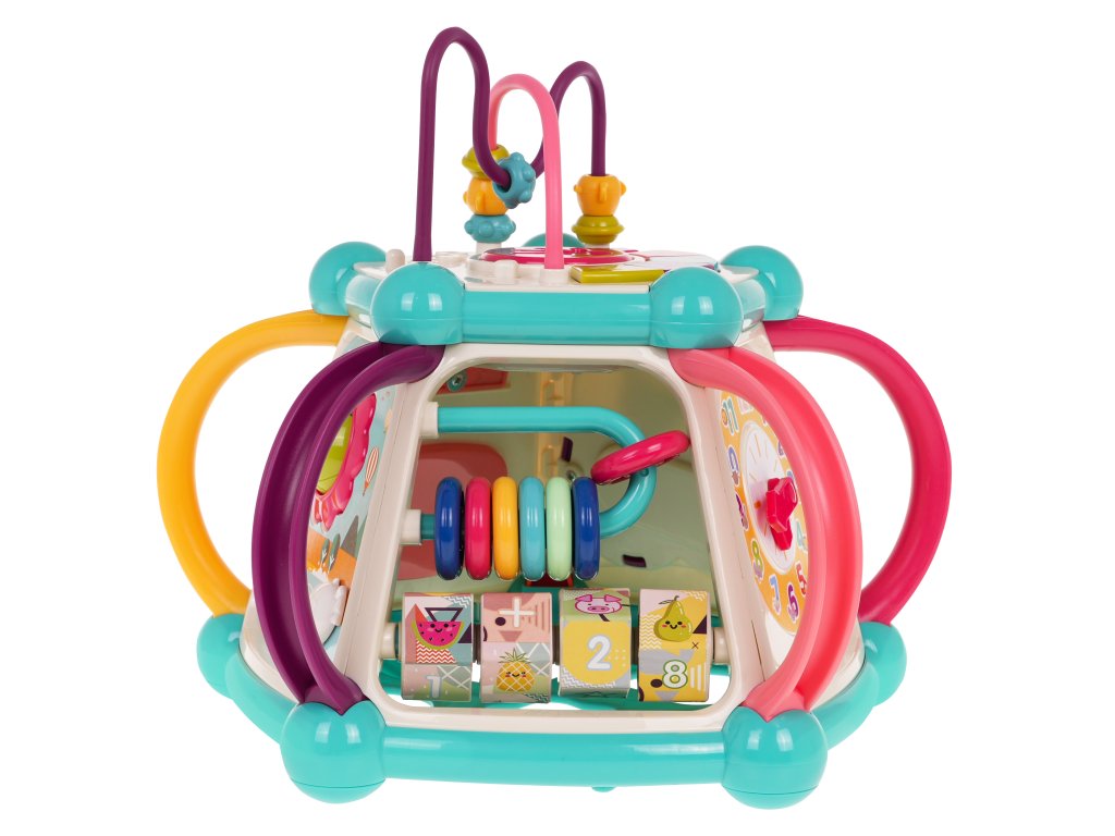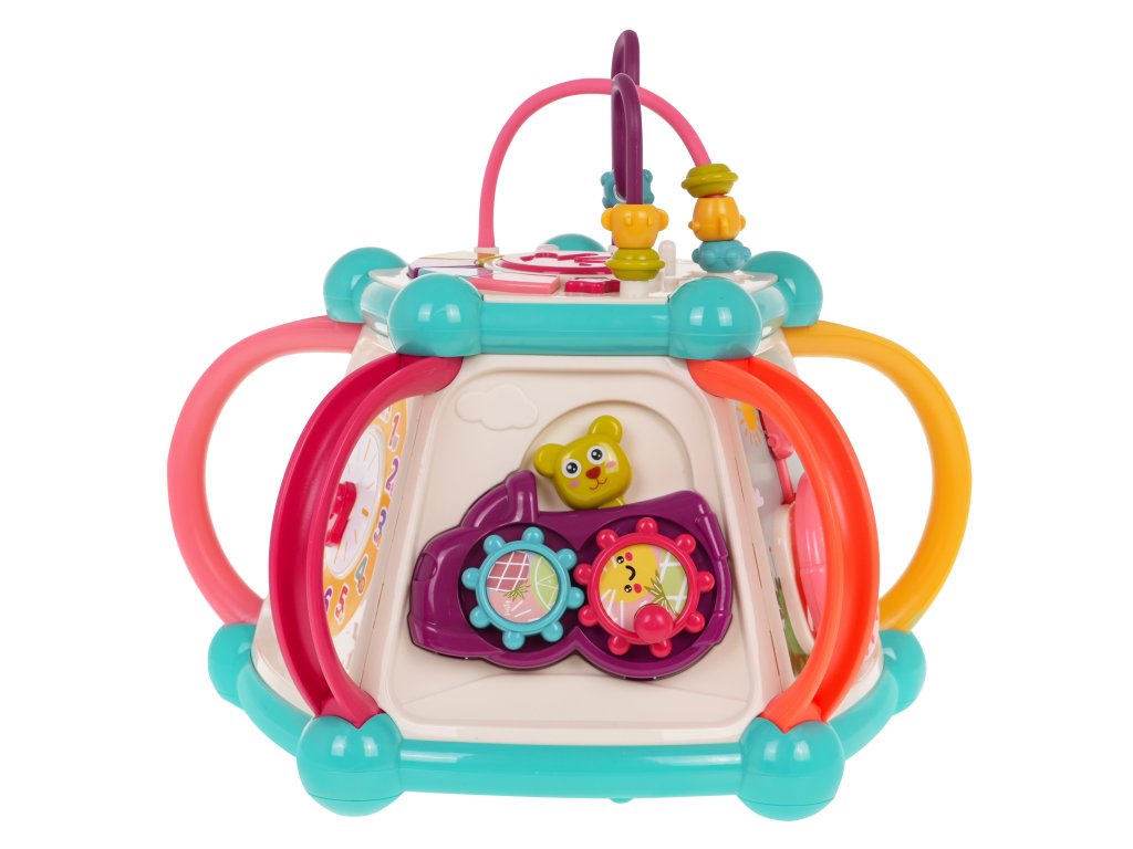 - suitable for children from 6 months of age, - made of safe materials of the highest quality, - the richness of colors encourages play and learning, - each wall hides different secrets, - sound effects: animal sounds, music, drum, gears spinning, sun rattle, clattering when moving the fish, - lighting effects: drum, illuminated keys, - moving elements: beads on the interleaving, sun, fish, beads on the abacus, rotating blocks, clock hands, gears with a teddy bear, steering wheel with a car, - sandwiches, - lots of fun options, - block sorter, - learning through play. |