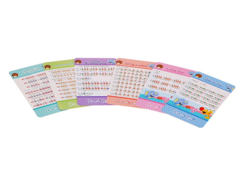 - a large drum with a hitting pedal, - two medium drums, - two smaller drums, - 2 sticks, - music stand, - 2 x electronic plate, - stool. - microphone, - audio cable, - 6 cards with notes, | |