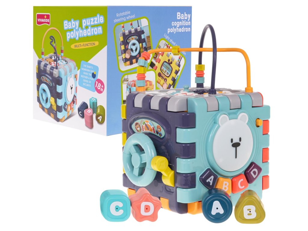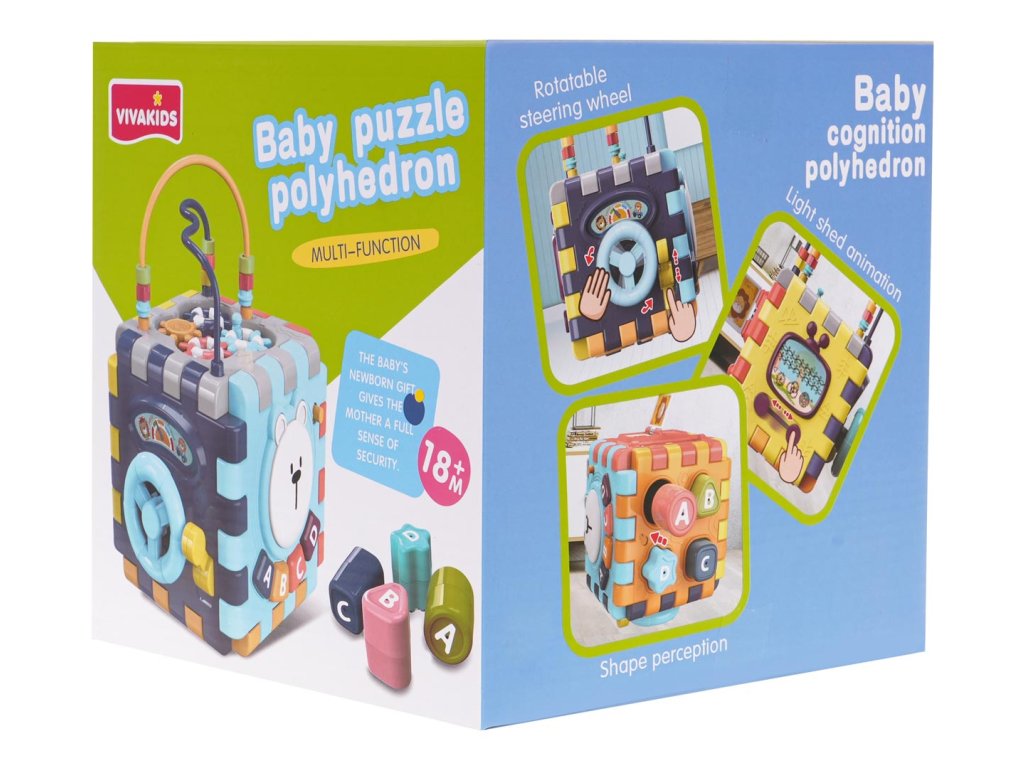 Multifunctional interactive cube with sound and light effects for children from 18 months of age. Each side of the box will provide the child with a lot of fun and interactive play. Sound and light effects and a wealth of colors will attract the baby's attention and encourage play. The cube can be unfolded and individual elements can be played with flat. The toy is powered by 3 x AAA 1.5 V batteries (not included).