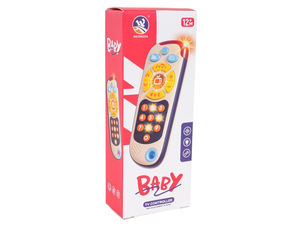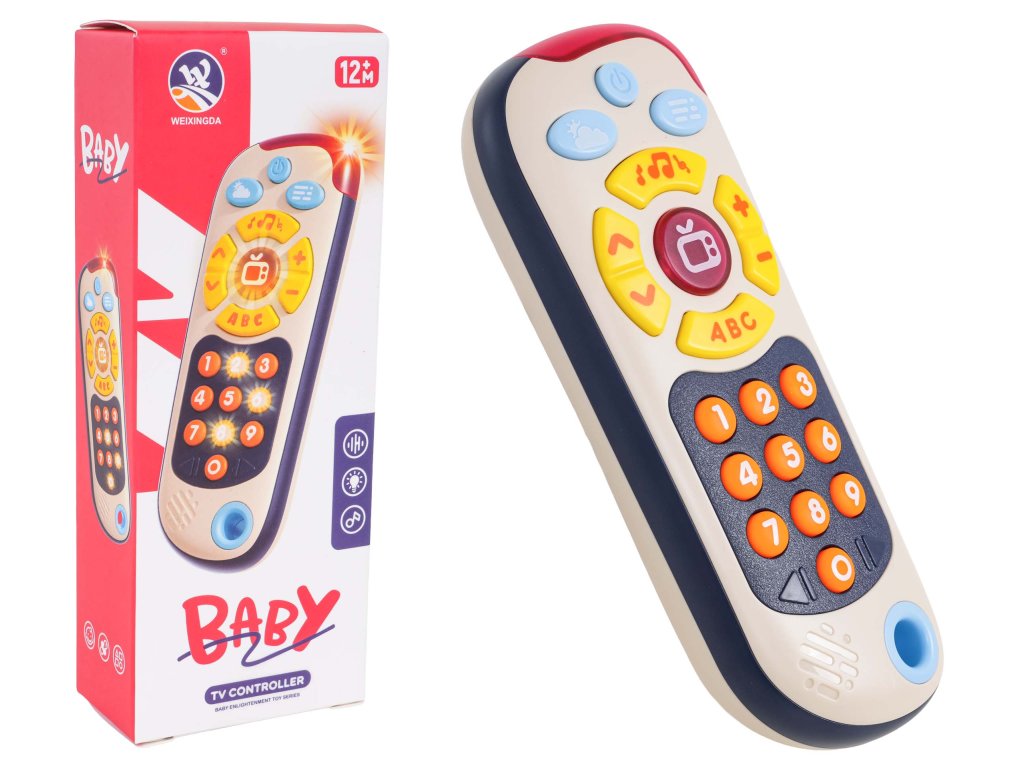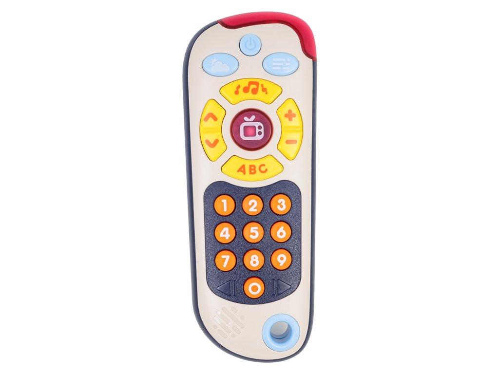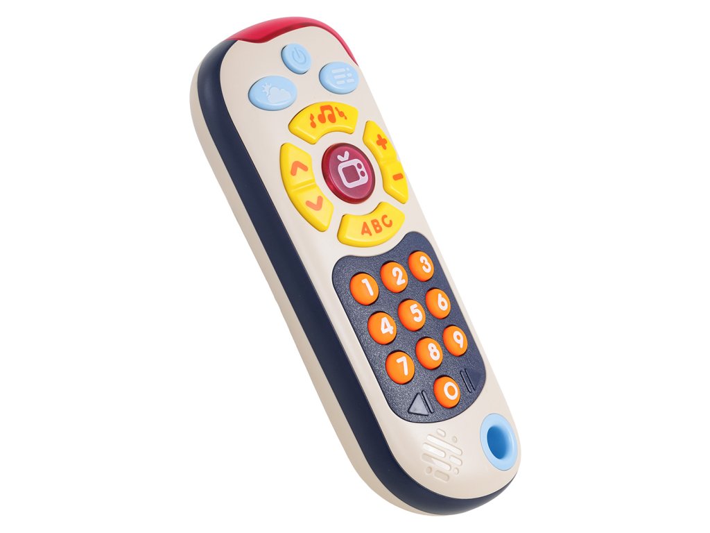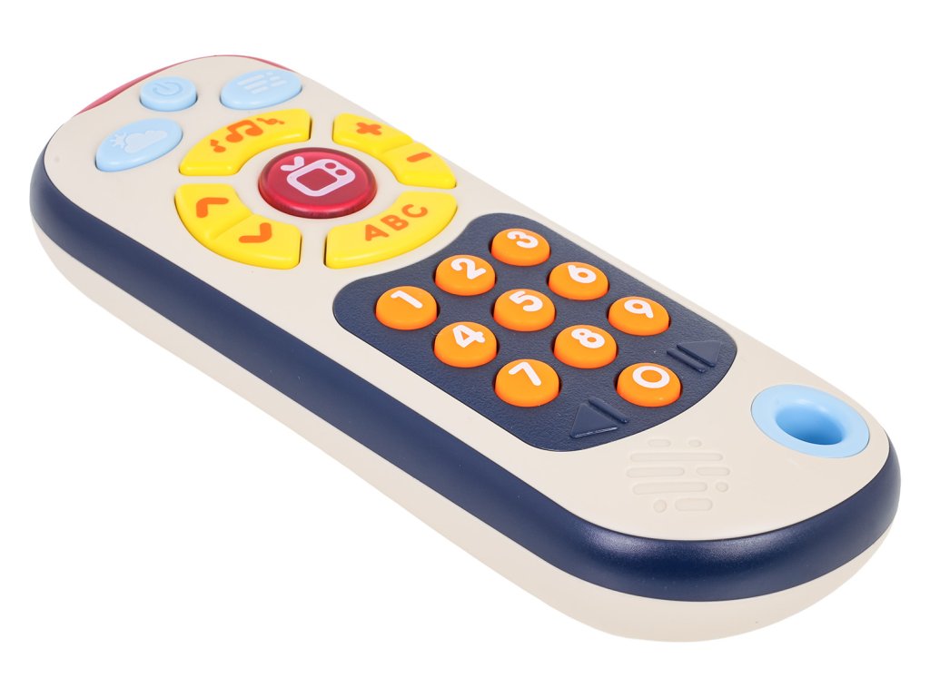 An interactive remote control for babies from twelve months of age. Made of high-quality plastic and free from sharp edges, the toy's rich colors and functions attract baby's attention and encourage interactive play. The top of the remote is backlit and features three blue buttons: an on/off switch, a cloud button that teaches weather (sunny, windy, rainy), and a mode selector: numbers, TV channels, and whack-a-mole. Below is a yellow circle of buttons, and in the center of the circle is an illuminated TV button. The musical note and ABC buttons activate melodies, +/- adjust the volume, and ^/v toggle between modes. At the bottom is a numeric keypad from 0 to 9. In numeric mode, pressing a number plays its name in English and an animal sound. In TV mode, pressing a button plays sounds: music, animal sounds, greetings, emotions, names of months, foods, seasons, and weeks. In whack-a-mole mode, the buttons light up, requiring your little one to press them skillfully. The toy is powered by 2 x AAA 1.5V batteries (not included).
