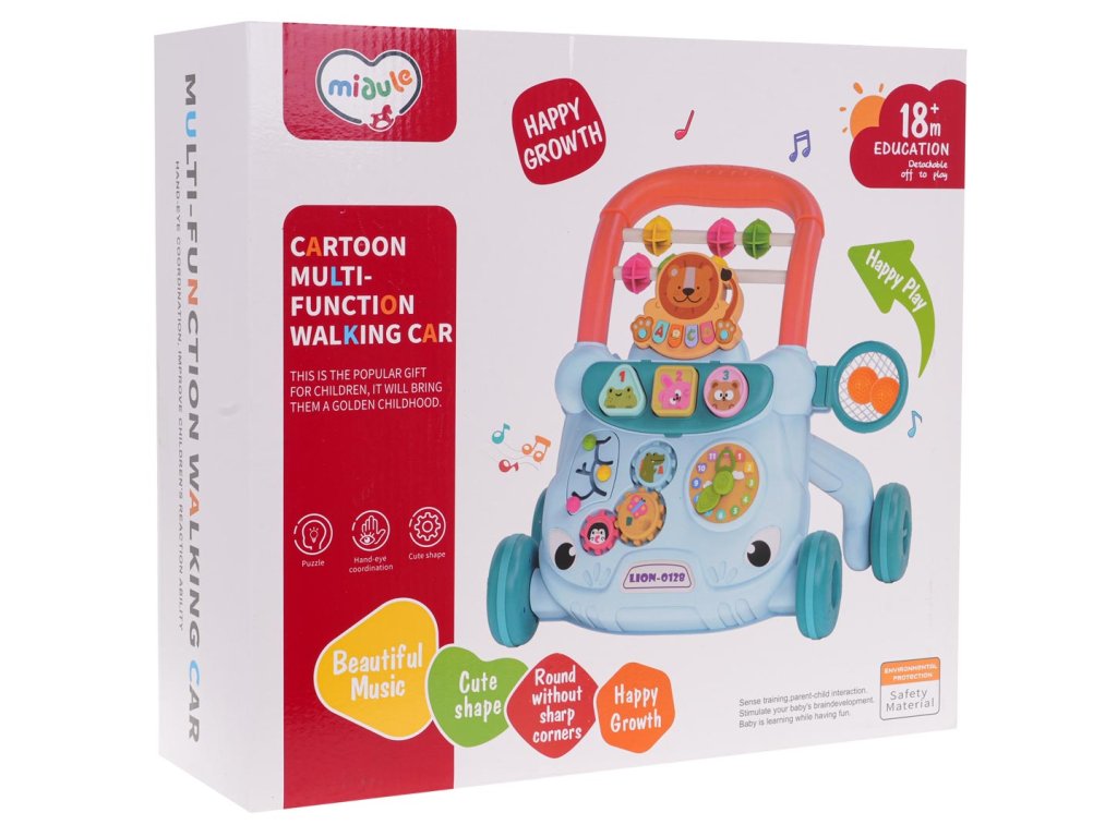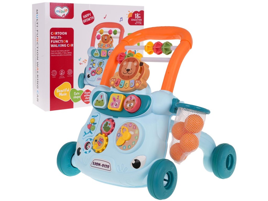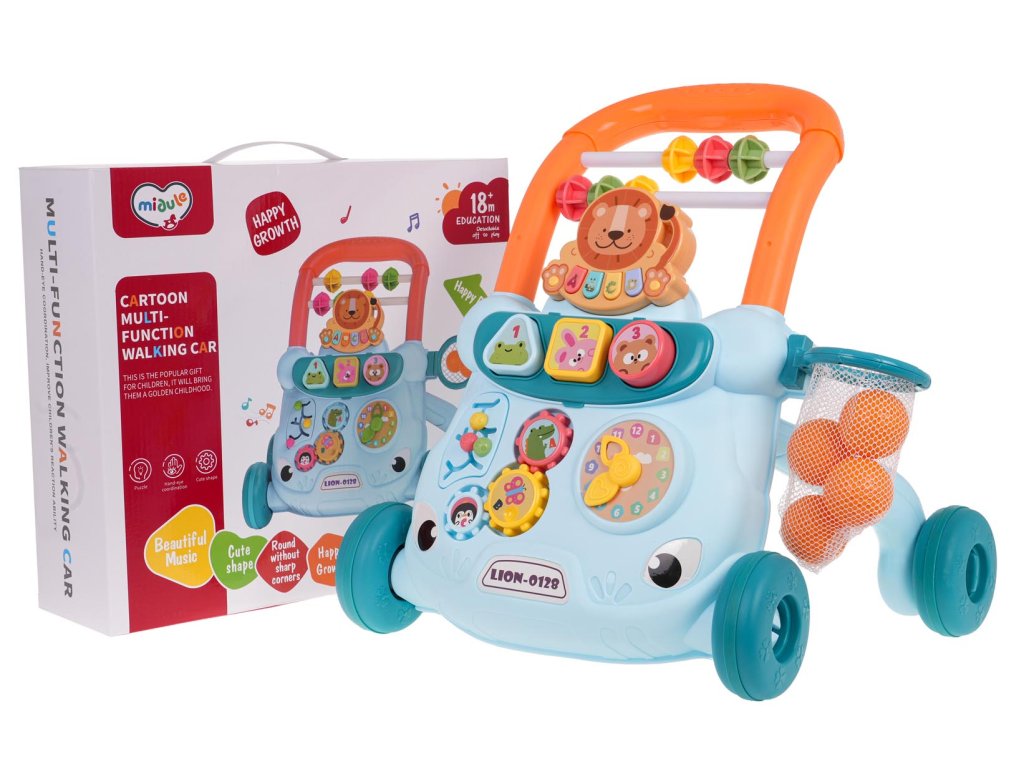 - suitable for children from 18 months of age, - made of the best quality plastic, - stable construction with the possibility of additional load, - wide wheel track, - wheels with rubber tread, - comfortable handle, - ball basket, - multifunctional panel, - clock with moving hands, - gears for turning, - layered sandwich, - piano with music and animal sounds, - abacus. |