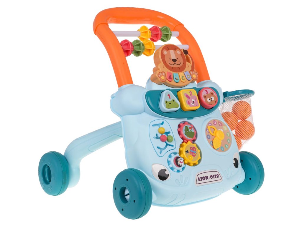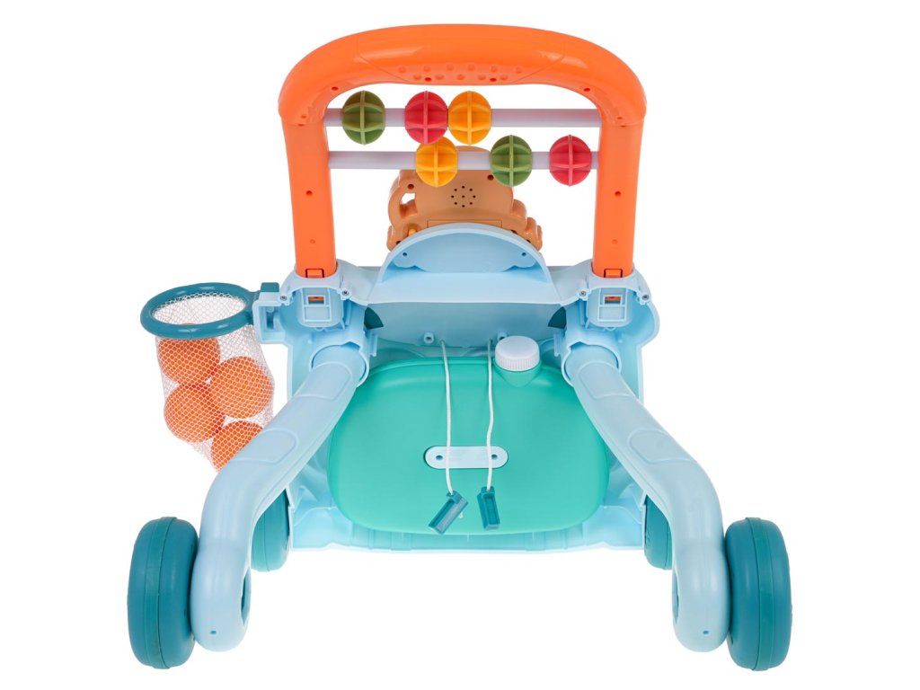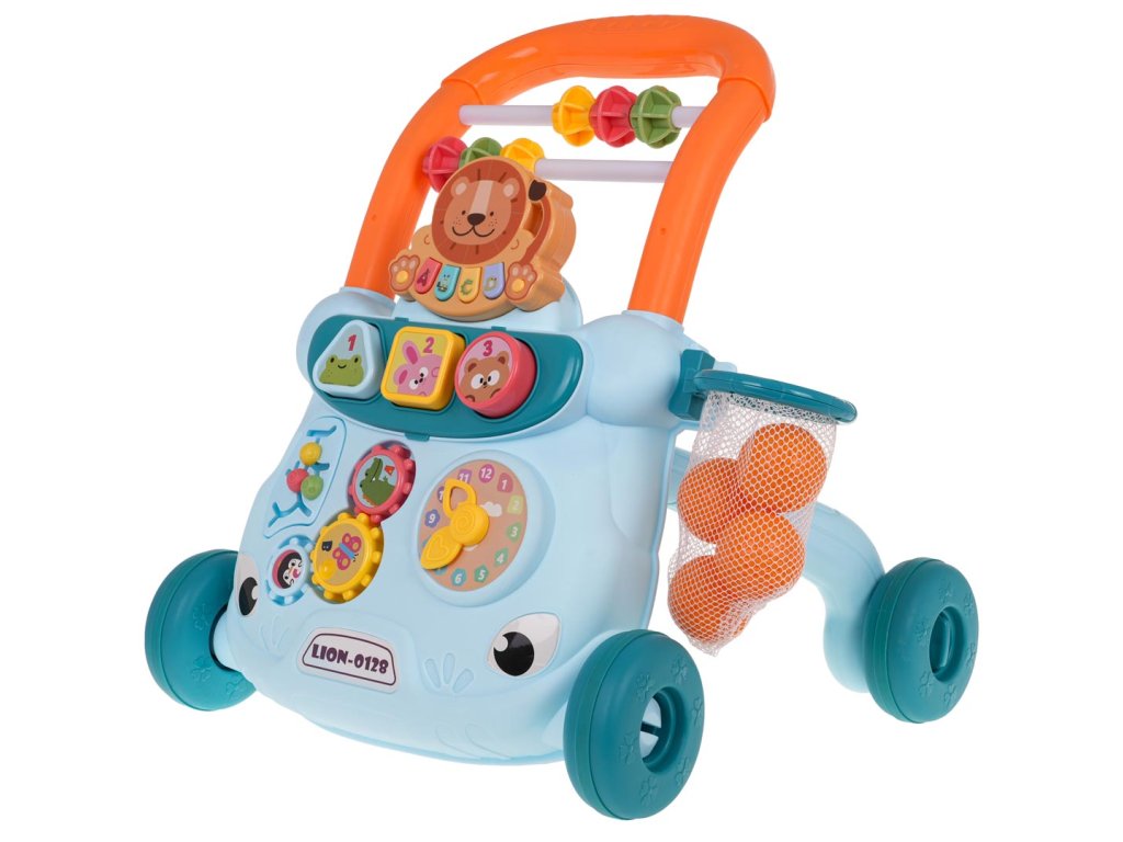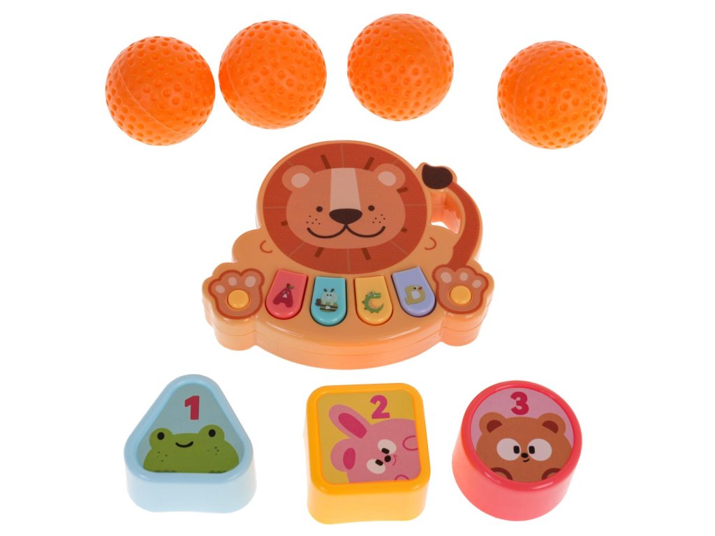 Interactive ride-on , pusher for children from 18 months of age. The ride-on is made of the best quality plastic in vivid colors that attract the child's eye. It has a stable structure, which can be additionally weighted with water or sand and a wide wheelbase. On the side of the ride- on there is a basket for balls, and the set includes four additional balls. On the front of the ride-on we have an interactive panel with lots of buttons for pressing, turning, shifting. On the left side of the panel there are 3 gears for spinning and a maze with balls for shifting. On the right side we have a clock with moving hands. At the top is a shape sorter with 3 blocks to match. Above the sorter is a piano with four keys with melodies and animal sounds. The child can remove the piano from the panel and take it anywhere with them. Above the piano is an abacus with 6 large beads. The piano is powered by 2 x AAA 1.5 V batteries (not included).