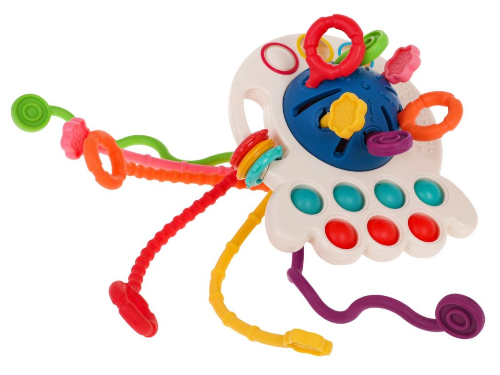 Sensory toy 4 in 1, octopus for children from 18 months of age. The toy is made of materials safe for the baby and does not have sharp edges. Vivid colors encourage the child to play. The toy can be used as a teether, the baby can pull, press, move various elements and practice hand-eye coordination. The toy can be attached to a cot, stroller or seat, during car travel.