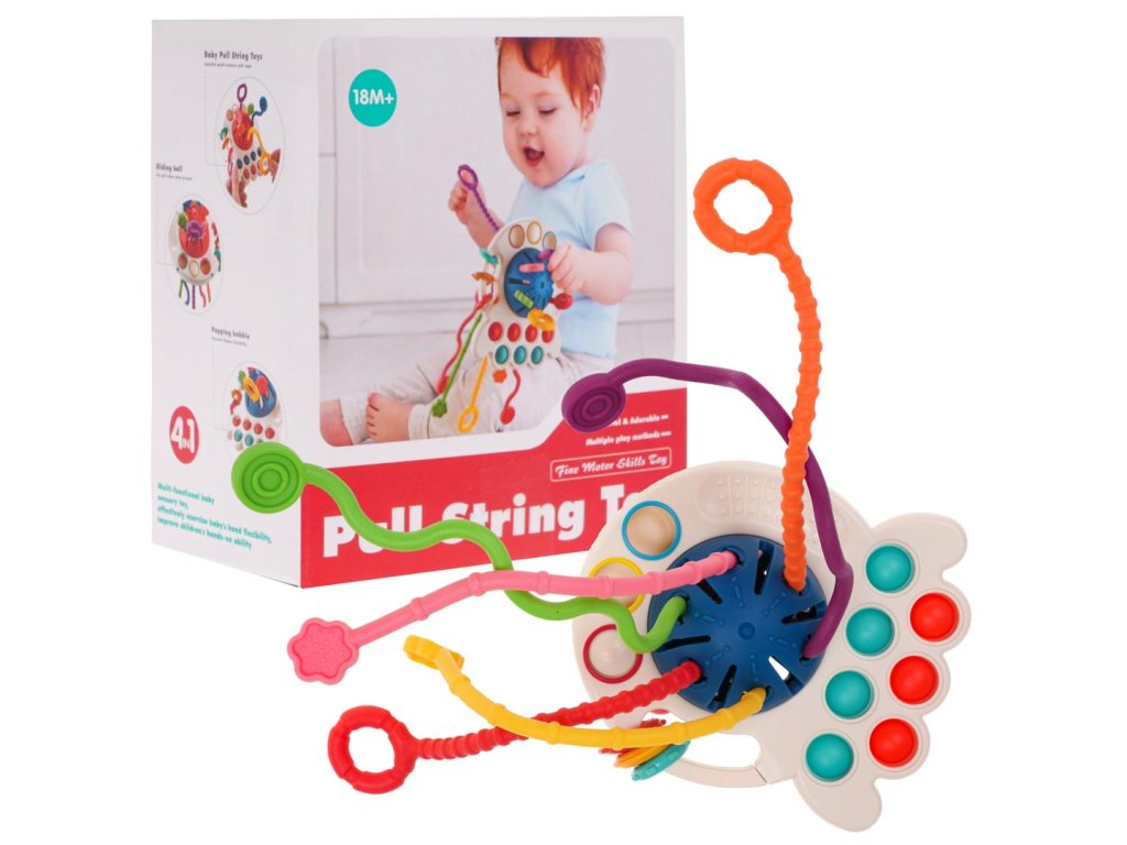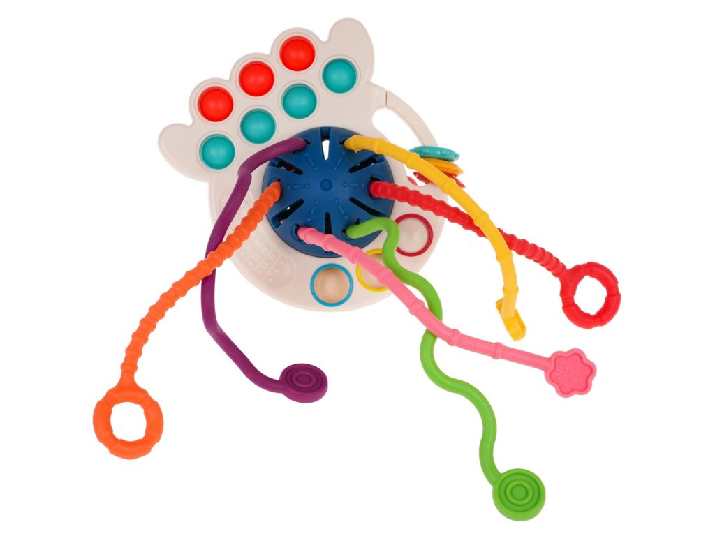 - suitable for children from 18 months of age, - made of safe materials, - vivid colors attract the baby's attention, - lots of fun options: * rubber strings for pulling and biting, * pop it – pressing and squeezing bubbles, * moving the button in slaloms, * layered with beads, - possibility of mounting the toy in various places: cot, stroller, etc. - easy to keep clean. |