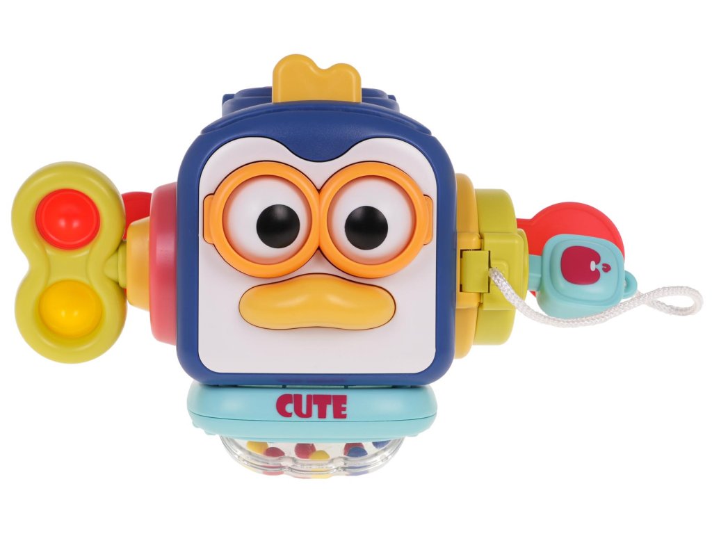 The baby presses the button and the penguin moves its eyes and a whistle sounds. Wall with rubber clamp, movable flower and bunny.