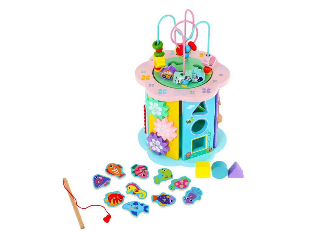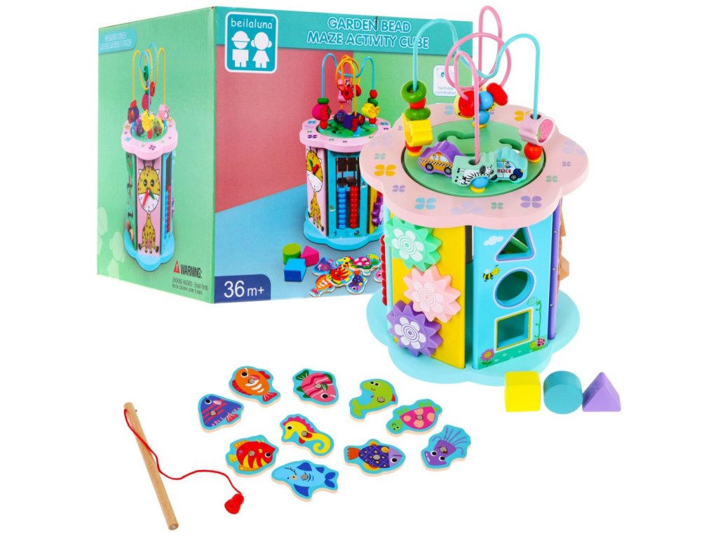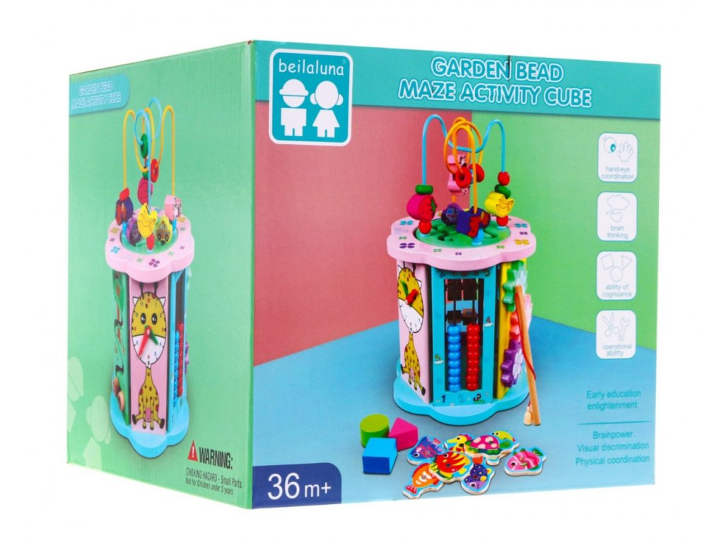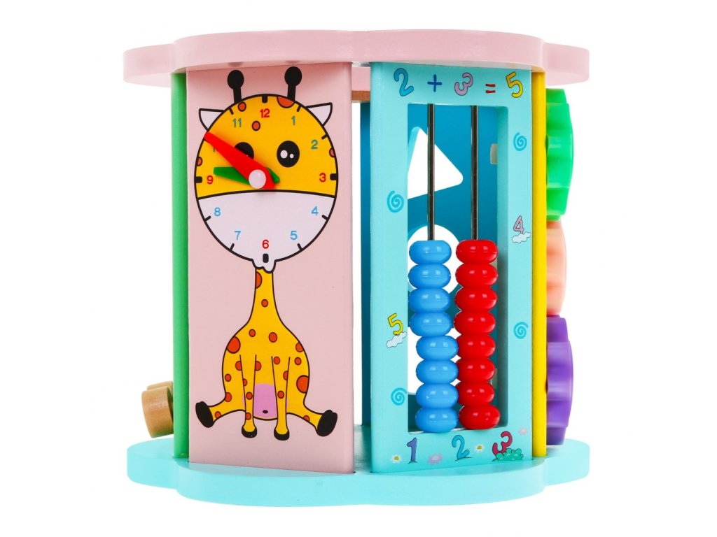 Wooden educational multifunctional cube is a tool for learning through play. It is intended for children from 3 years of age. It is made of safe materials, the wood is covered with non-toxic colored paint in pastel colors pleasant to the eye. It has a streamlined shape without sharp ends. In the upper part there is a maze with beads, fruit and animals, and cars sliding on the track. This part can be detached from the whole. In the middle of the cube there is a place for blocks and animals with magnets that were included in the set. There is a lake on the bottom of the cube where you can place animals with magnets, and then fish them with a fishing rod. The presented cube is an 8-in-1 toy, each wall has different tasks. Blue wall with an abacus On this wall, the child will be able to perform the first math operations: addition and subtraction. Pink wall with a clock The child will get acquainted with the clock, learn to recognize the time. Green wall with a labyrinth with animals The sliding elements perfectly support the development of toddlers and develop manual dexterity. A purple wall with a puzzle with letters and animals Learning to recognize numbers and count. Blue wall sorter The child learns to recognize shapes, colors, and how to sort objects. Improves manual skills, exercises the efficiency and precision of small hands movements. Yellow wall, colored gears making a mechanical noise Playing with gears triggers creativity in the child, teaches observation and concentration. The fun with this cube will not end quickly, and thanks to the solid quality of workmanship, it will serve the child for a very long time. | |