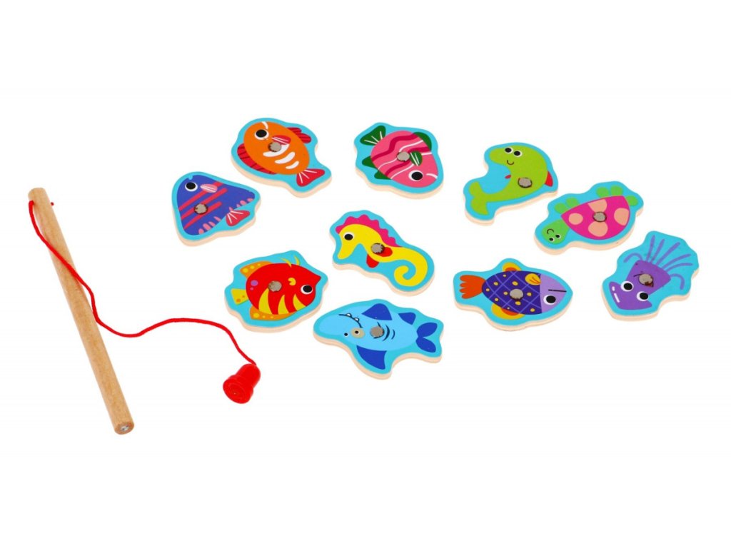 - a cube with a removable upper element, - colored blocks: blue circle, purple triangle, pink square, - five colorful fish with magnets, jellyfish, shark, water horse, dolphin, turtle, - a magnetic rod. | |