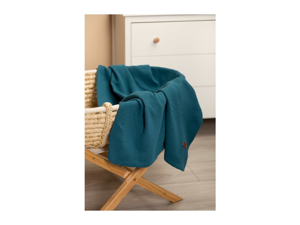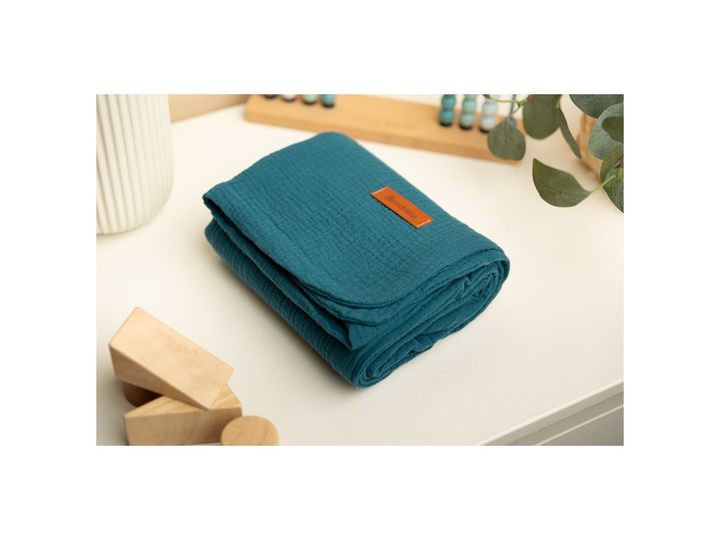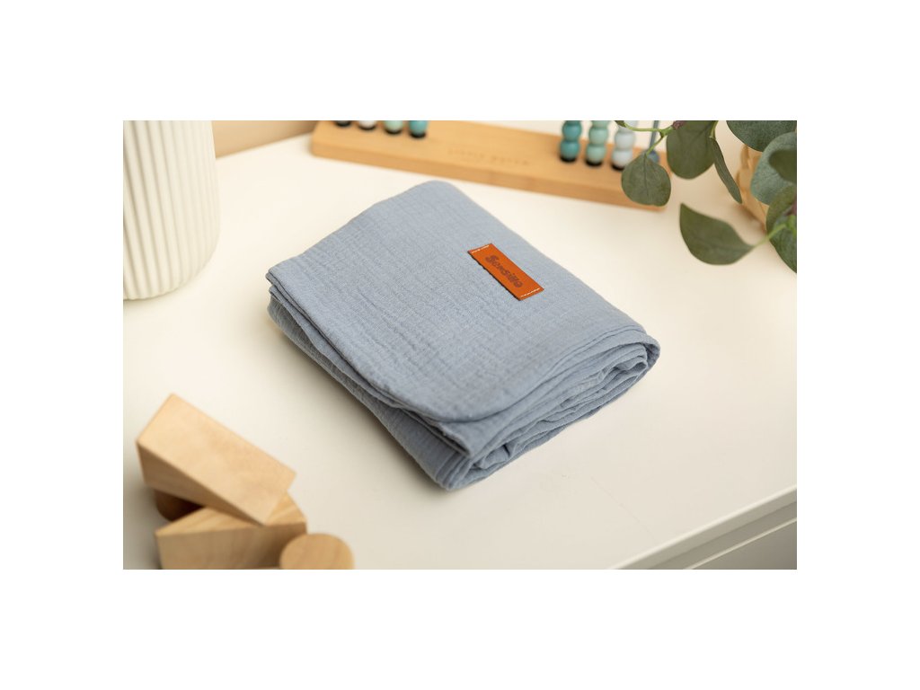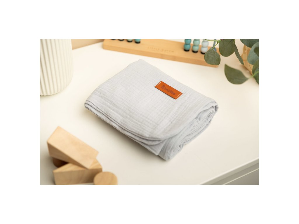 Mušelínová deka je vyrobena z vysoce kvalitní 100% bavlněné tkaniny. Je vyroben ze dvou vrstev bavlny, takže je lehký a vzdušný. Bude dobře fungovat při procházkách za teplých slunečných dnů, může být použita jako silnější plena, pro každodenní hry nebo jako kryt během krmení. Jemná bavlna zajišťuje dostatečnou cirkulaci vzduchu a také nezvyšuje citlivost ani nedráždí pokožku dítěte. Další výhodou přikrývky je krásná textura tkaniny.