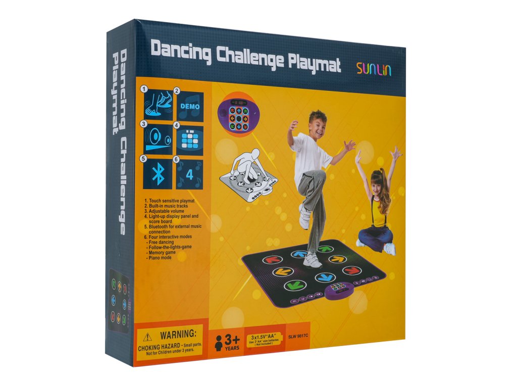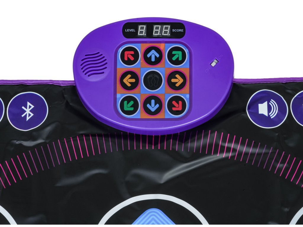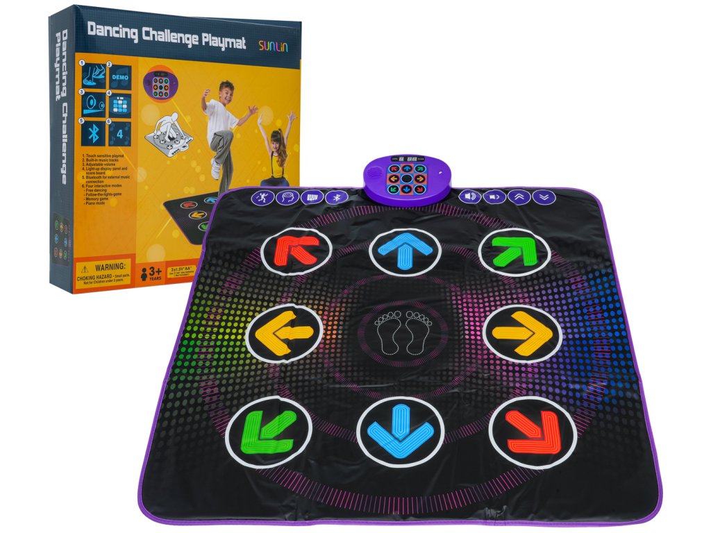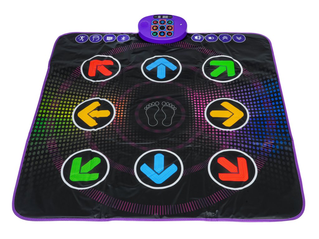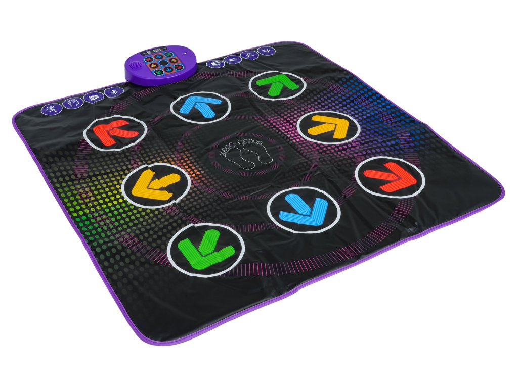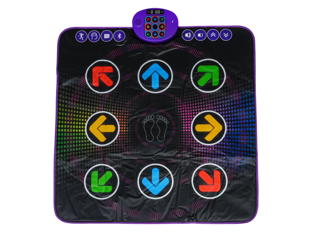 A dance and music mat for children aged three and up. Made of high-quality materials, it has a non-slip underside and a colorful, soft-touch top layer. The top of the mat features a display with illuminated arrows indicating the correct position on the mat. The display is powered by 3 x AA 1.5V batteries (not included). Below the display are touch buttons for mode selection, a Bluetooth switch, and volume and difficulty controls. The dance surface consists of a central area with a drawing of feet and eight arrows. You can dance in various ways by following the display indicating your position on the mat, using memory mode, which shows you the movements you need to perform and repeating them, or dancing freely and producing sounds like a piano. You can also connect the mat via Bluetooth and play your favorite music. You can adjust the volume and difficulty level. This is an ideal mat for children who enjoy being active. The mat improves motor coordination, hones your musical ear, and is a great way to spend active time together.