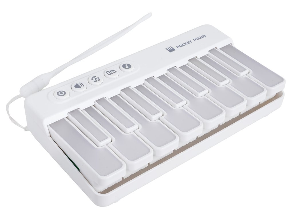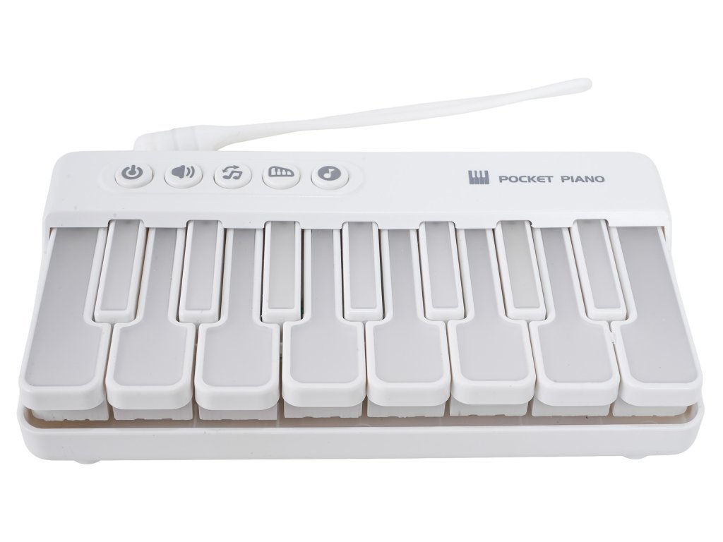 A portable white piano for children aged three and up. The piano will be helpful in learning to play, thanks to its illuminated keys that indicate how to play. Its lightweight and compact design makes it easy to take anywhere. The toy is powered by 3 x 1.5V AAA batteries (not included).