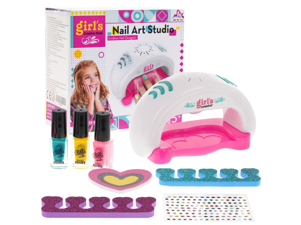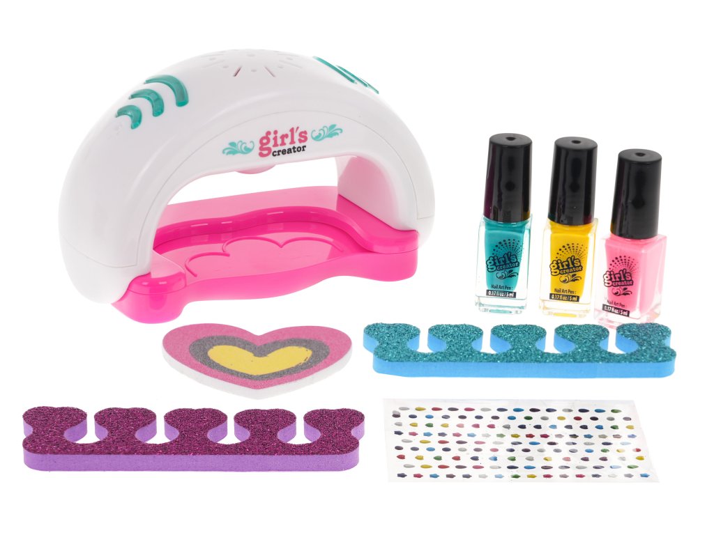 - nail dryer, - three nail polishes, - nail file, - two finger separators, - nail jewels. |