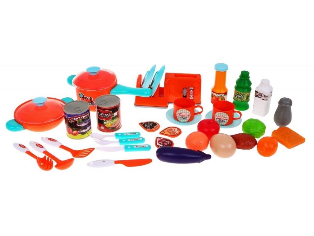 - kitchen with tap, oven, shelves, cooking hob, - toaster about 8.5 cm x 7 cm x 7 cm, - stickers for self-decorating the kitchen, - pot with lid approx. 9 cm x 11 cm x 22 cm, - frying pan with lid approx. 7 cm x 12 cm x 17 cm, - a plate with a diameter of approx. 8 cm, - 2 x cup about 4 cm x 4.5 cm, - a bottle with milk about 8.5 cm x 3 cm, - a bottle with citric acid approx. 9 cm x 4 cm, - a bottle with tomato sauce approx. 10 cm x 4.5 cm, - can of tin, approx. 6.5 cm x 5.5 cm, - tin with sardines approx. 6.5 cm x 5 cm, - ladle, spatula, colander approx. 13 cm x 3.5 cm, - a small fork, knife, spoon about 11 cm x 2.5 cm, - a large knife approx. 13 cm x 2.5 cm, - vegetables (cabbage, tomato, carrot, eggplant), - fruit (orange), - boiled egg, - chicken leg, - toast - salt shaker approx. 6.5 cm x 4 cm - sachets of black and latte coffee and milk. | |