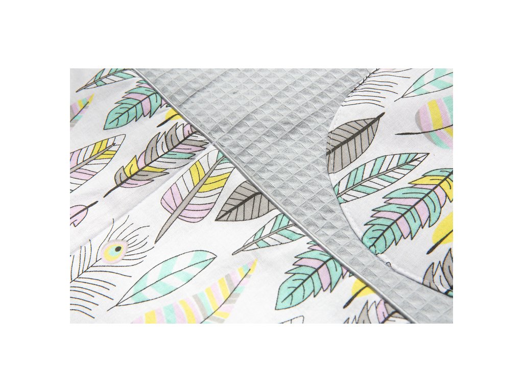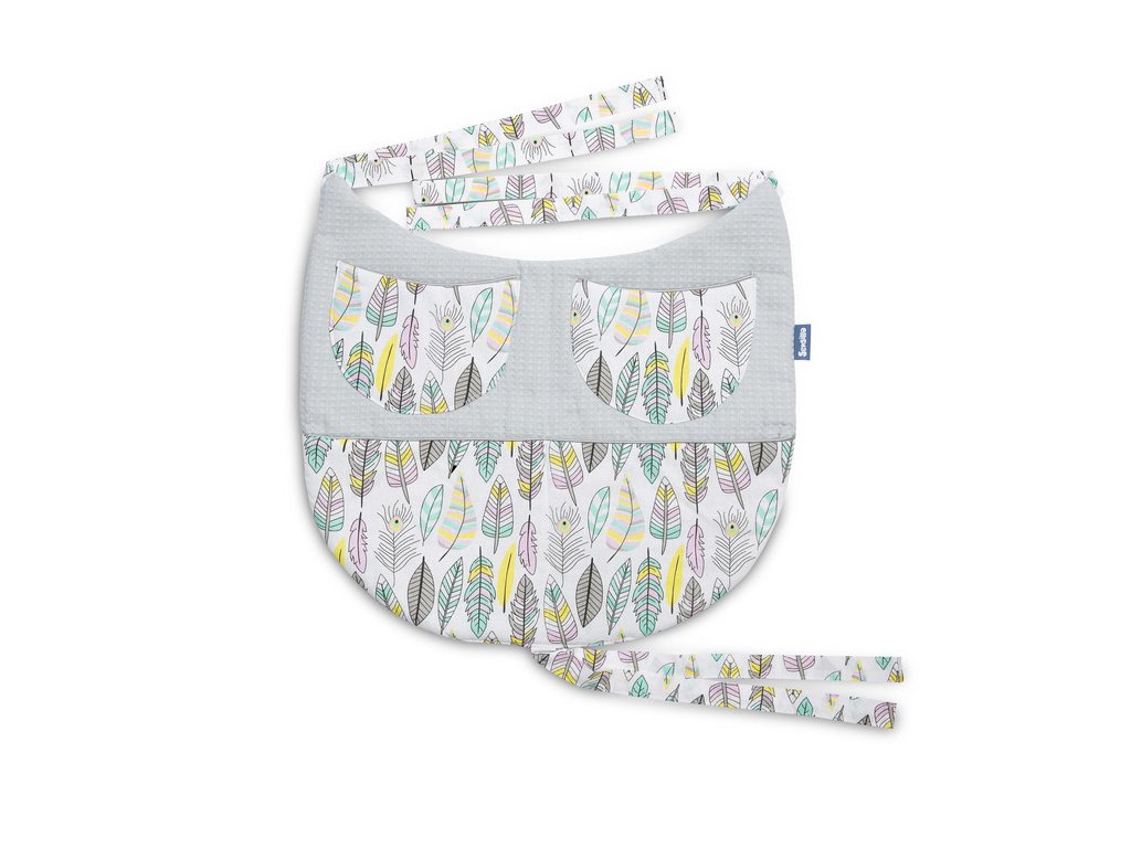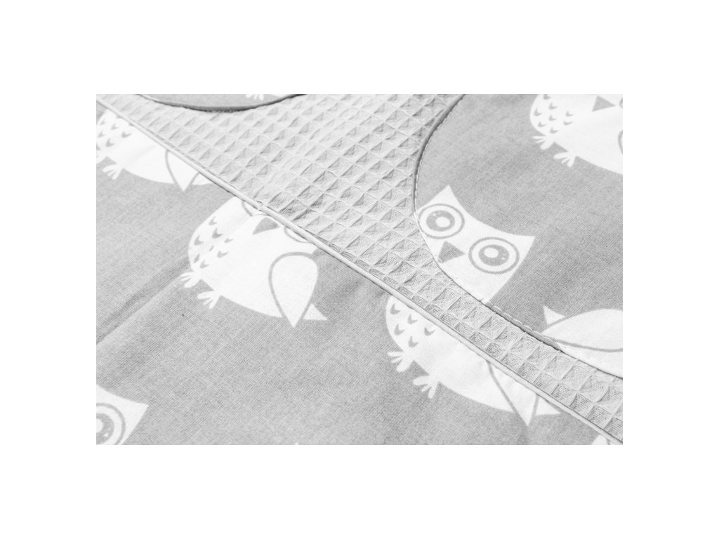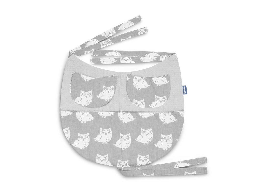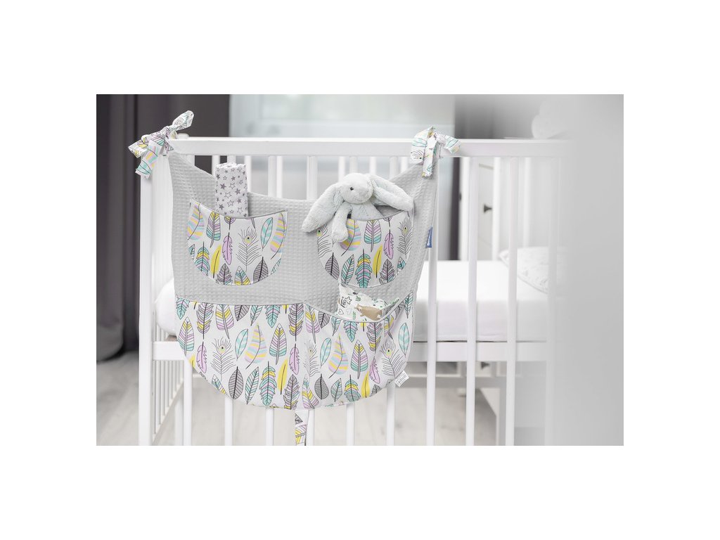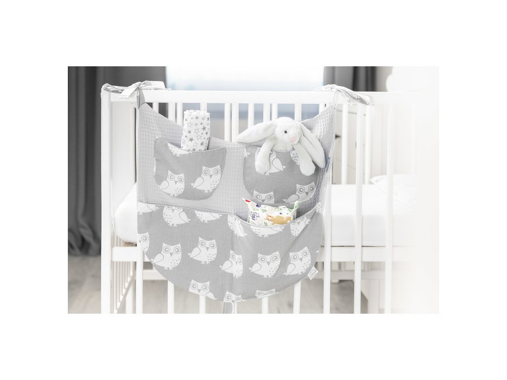 Organizér na dětskou postýlku Wafel je nejen praktickým produktem, ale také dekorací dětského pokoje. Jeho tvar připomíná hlavu sovy. Má celkem 4 kapsy, do kterých se vejde veškeré potřebné příslušenství. Organizér lze snadno připevnit na rám postýlky všitými stuhami. Na obou stranách je ozdoben 100% bavlnou a uprostřed je vrstva antialergické náplně.