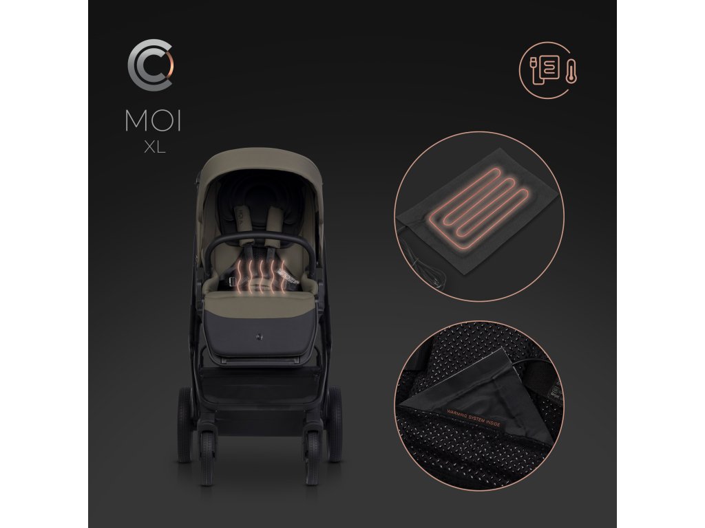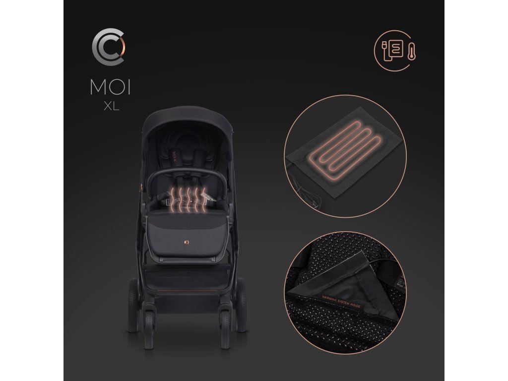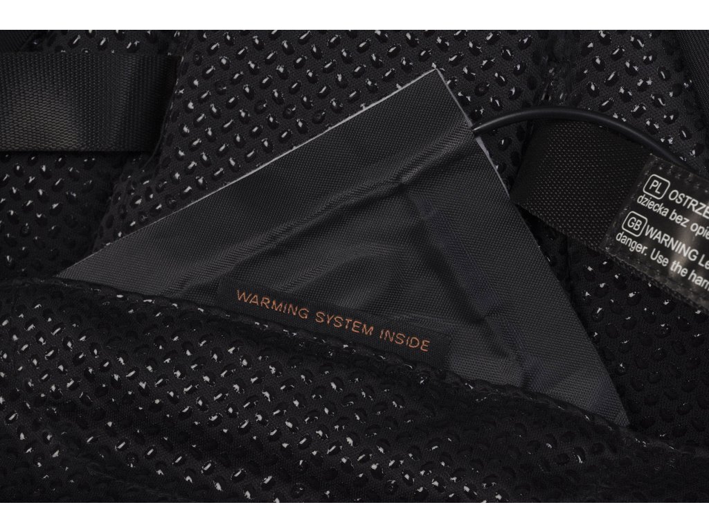 Kočárek je vybaven speciálním pouzdrem na powerbanku, kterou lze namontovat na určená místa a připojit k němu USB kabel pomocí systému chrániček používaných v čalounění kočárku. Topné panely jsou zcela bezpečné a dlouhodobě se používají v outdoorovém oblečení. Poskytují příjemné teplo a jsou ideální pro chladné měsíce.