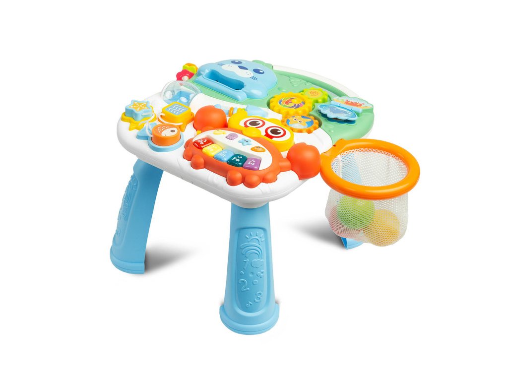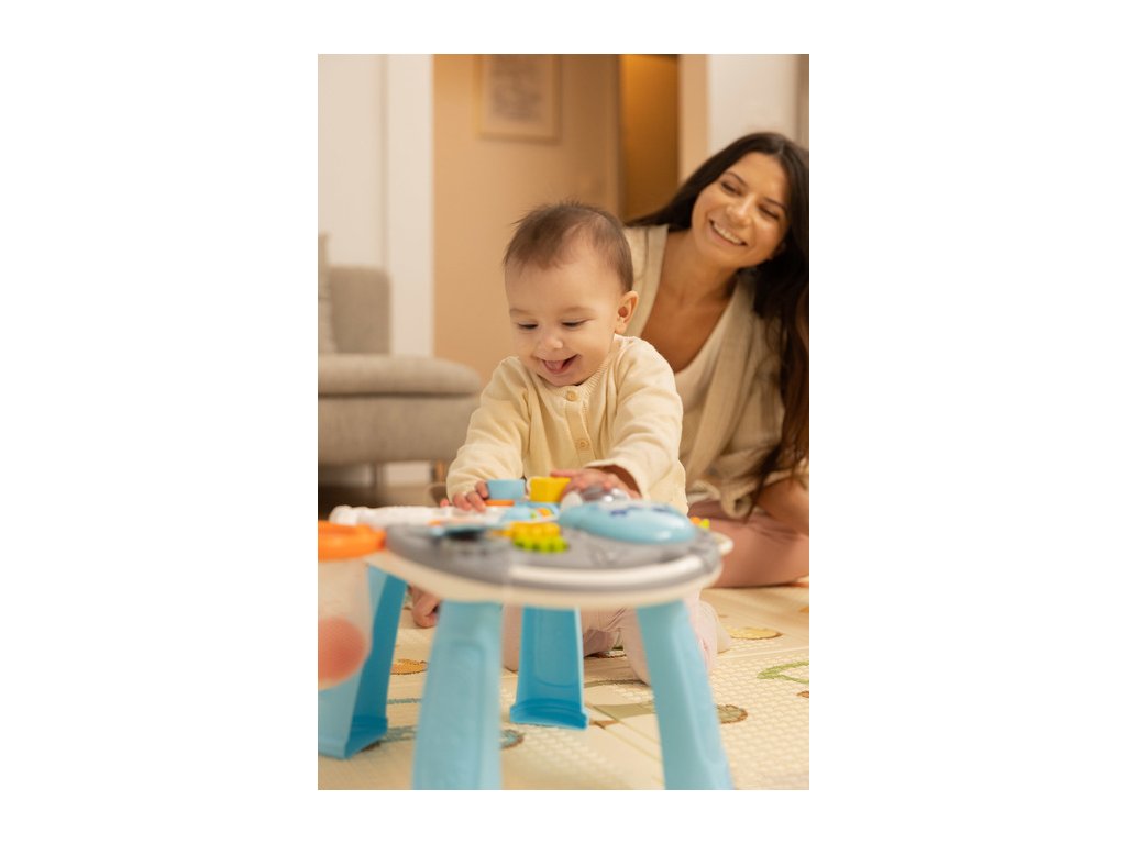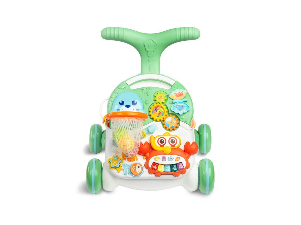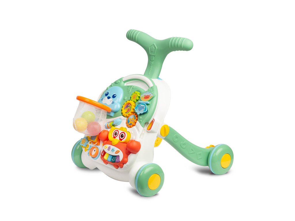 Díky kombinaci několika možností v jedné hračce zabaví vaše batole na mnoho hodin. Dá se použít jako odstrkovadlo nebo interaktivní stůl se spoustou atrakcí. Hrací dobu zpříjemní košík, do kterého může vložit 3 plastové míčky s chrastítkem, bateriové a vyjímatelné piano ve tvaru kraba, točící se ozubená kola a mnoho dalších překvapení. Přední panel lze sejmout a proměnit v hrací stolek.