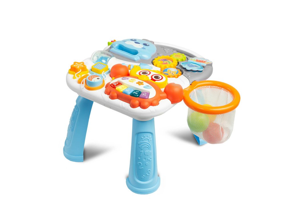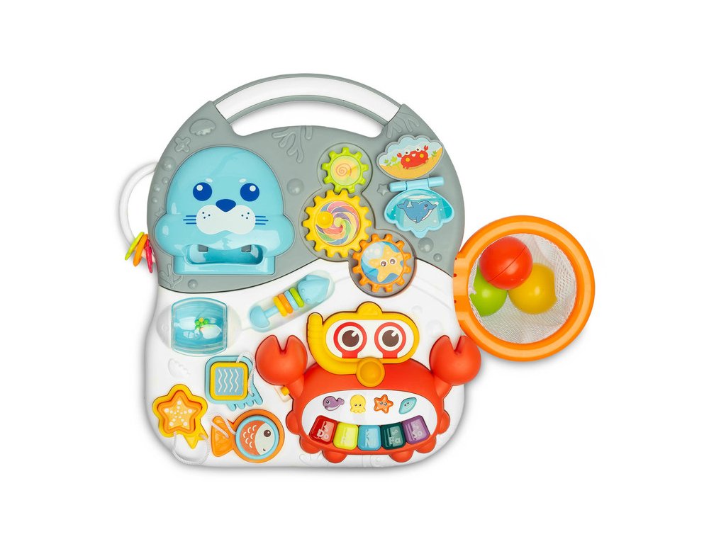 - Interaktivní panel – Obsahuje různé tlačítka, které rozvíjejí smyslové dovednosti dítěte a podporují kognitivní rozvoj. Panel nabízí zvukové efekty, melodie a světelné efekty.