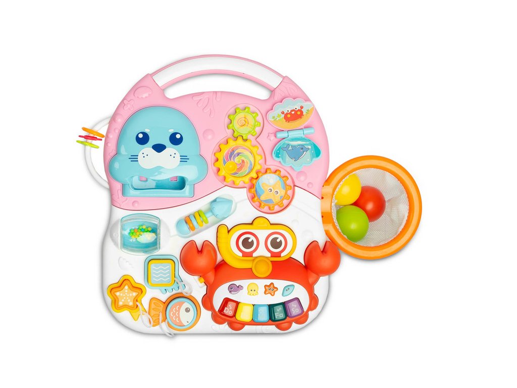 - Interaktivní panel – Obsahuje různé tlačítka, které rozvíjejí smyslové dovednosti dítěte a podporují kognitivní rozvoj. Panel nabízí zvukové efekty, melodie a světelné efekty.