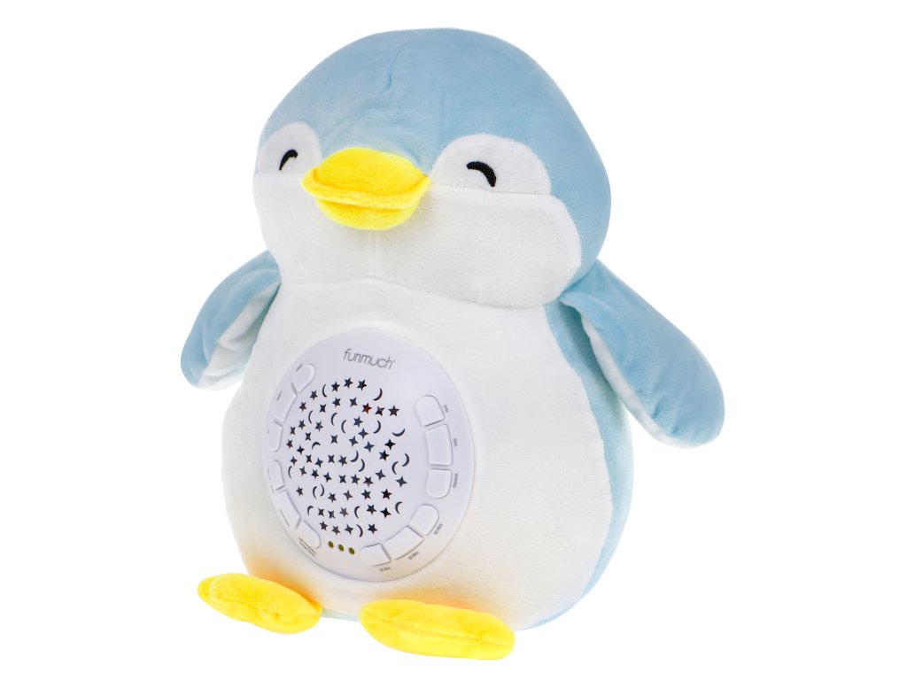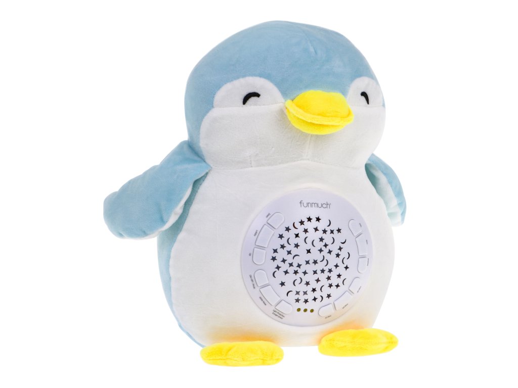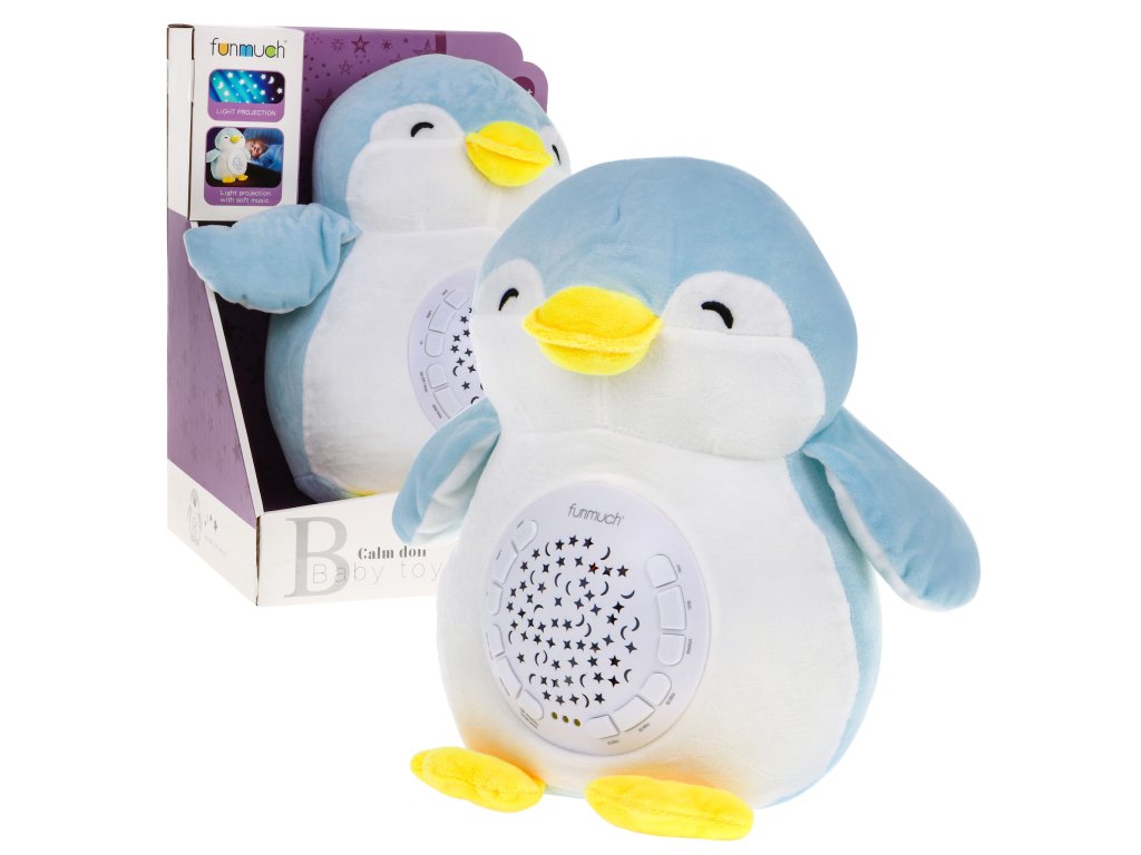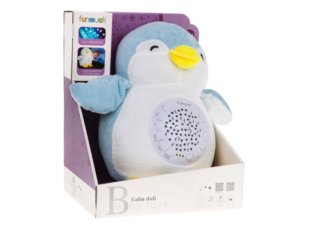 A plush, large penguin with a built-in projector and music box is a toy for children from the first days of life. Nice to the touch, soft mascot has a module in the belly from which sounds and great effects come out. The module is removable and the penguin can be washed in the washing machine, so it will always be clean and fragrant. The module is powered by 3 x AA 1.5V batteries (not included). Module functions: - baby-friendly sounds and melodies: * romantic music, sounds of birds, the sound of the sea, heartbeat, - light effects - colorful stars projector, - module operation time setting function -30 min - 60 min - 90 min. - volume control function, The projector and music box functions can be used simultaneously or independently. | |