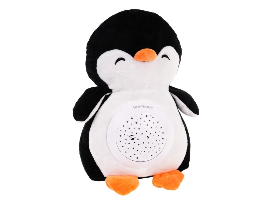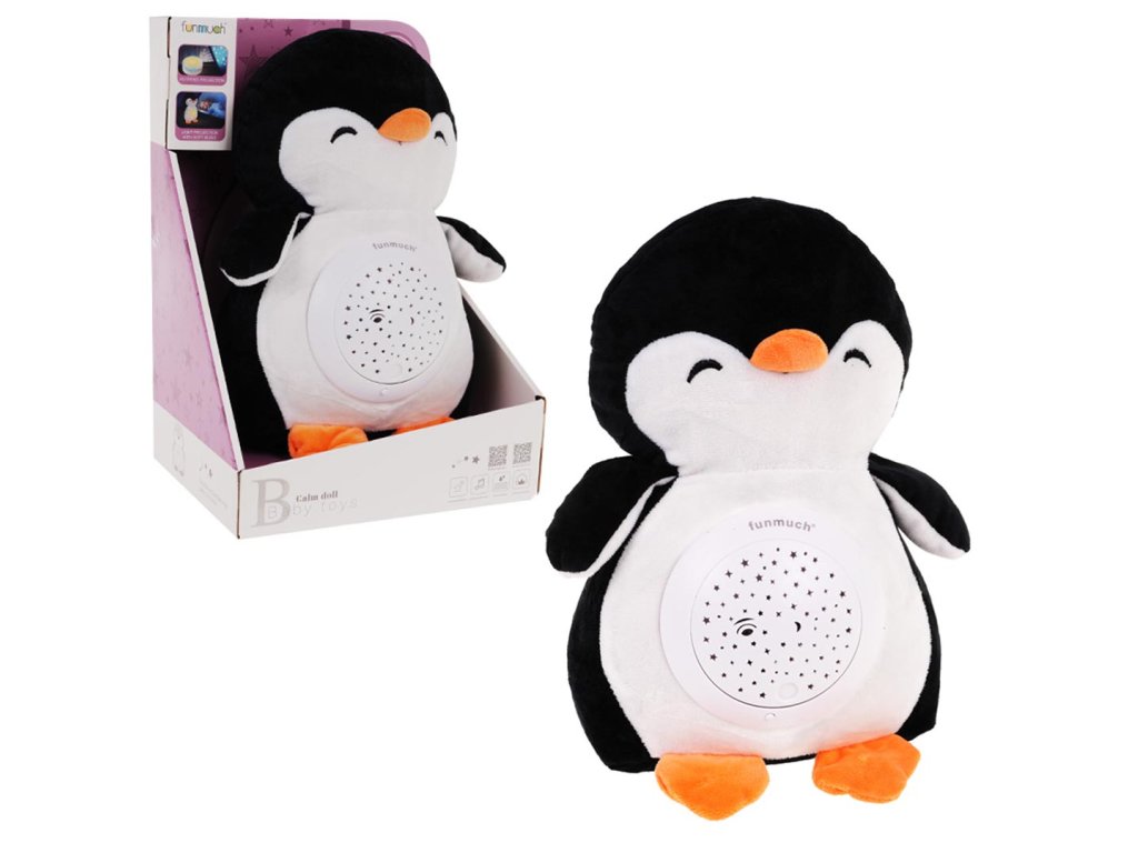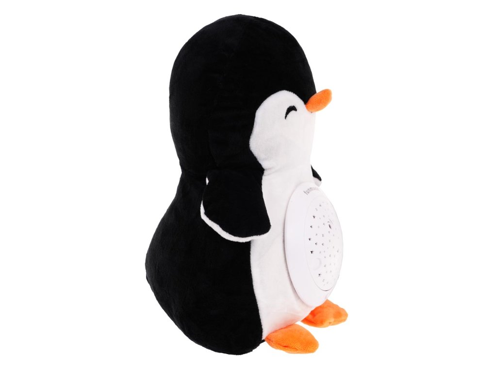 Plush, large penguin with built-in projector and music box, is a sensory toy for children from the first days of life. Pleasant to the touch, soft mascot has a module in the belly, from which sounds and great effects come out. The module is removable, and the penguin can be washed in the washing machine, so it will always be clean and fragrant. The module is powered by 3 x AA 1.5V batteries (not included). Module functions:
