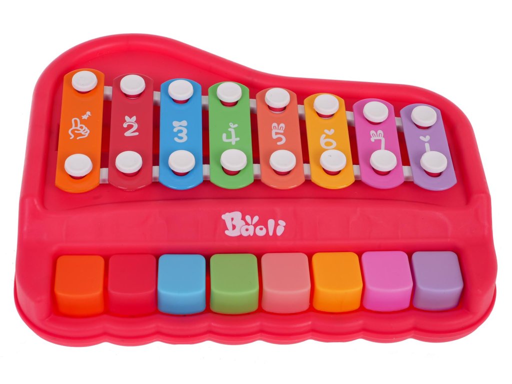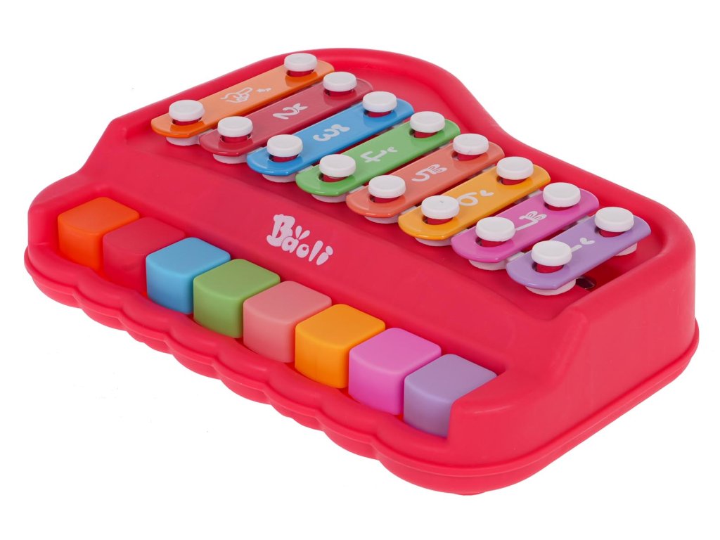 Set of 2 in 1 piano and cymbals for children from 18 months of age. The toy is made of the best quality plastic and metal, vivid colors attract the child's eye and encourage play. The set includes two sticks. Set Features: