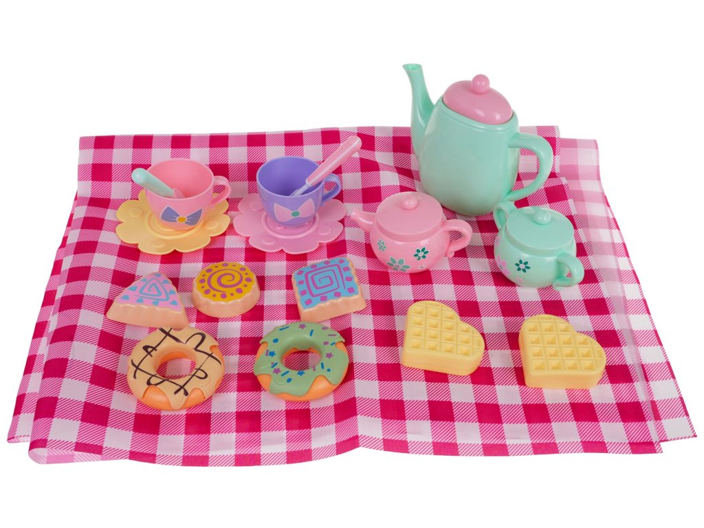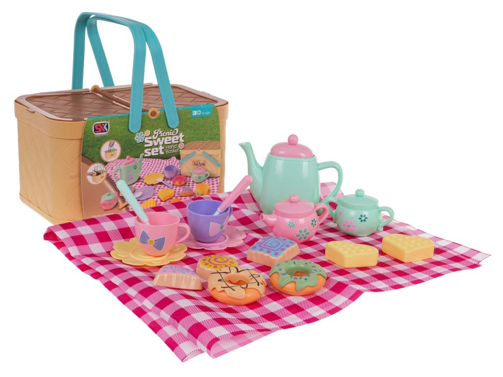 - picnic basket with handle approx. 26 cm x 14 cm x 16 cm, - picnic blanket approx. 60 cm x 79 cm, - tea pot approx. 10.5 cm x 12.5 cm x 5 cm, - cup with spout approx. 8 cm x 5.5 cm x 5.5 cm, - sugar bowl approx. 5.5 cm x 8 cm x 5.5 cm, - cup approx. 4 cm x 6 cm x - plate approx. 8.3 cm in diameter, - teaspoon approx. 9.5 cm x 2 cm x 1 cm, - waffles approx. 5 cm x 5.5 cm x 1.5 cm, - doughnut approx. 6 cm in diameter, - cookies 4.5 cm, - packaging approx. 26 cm x 14 cm x 16 cm. |