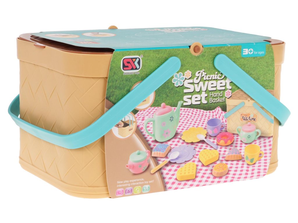 Picnic basket with accessories for children from 3 years of age. An ideal way to have fun outdoors. This richly equipped set consists of many elements: a spacious basket, a tea set and mock confectionery products. The set also includes a picnic blanket.