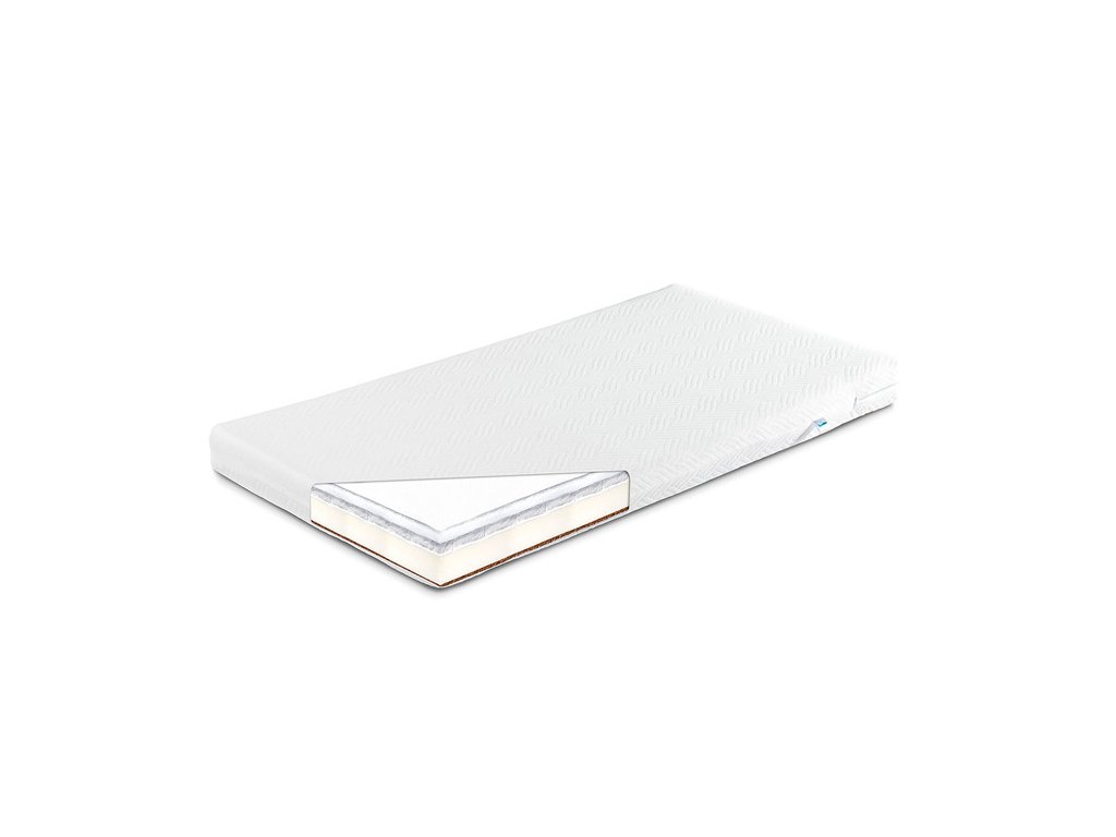 Vrstva přírodních kokosových vláken zpevňuje strukturu matrace. Je vzdušný a nezadržuje vlhkost. Další měkkost a trvanlivost zajišťují 2 vrstvy načechrané netkané textilie. Kryt je vyroben z odolného, ale jemného materiálu a v případě potřeby jej lze snadno vyjmout a umýt. Matrace má kladné stanovisko Ústavu matky a dítěte č. Op-4769-73, platné do 15.07.2018.