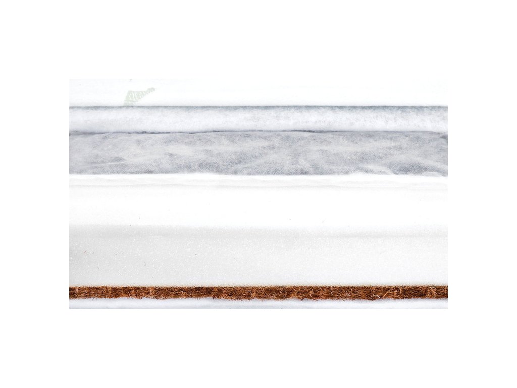 - výplní matrace je tunelová vložka vyplněná pohankovou slupkou (1-1,5 cm zapuštěná do pěny) a vrstvou kokosové rohože (1 cm) zabalenou do nadýchané netkané textilie, oddělené polyuretanovou pěnou (8 cm)