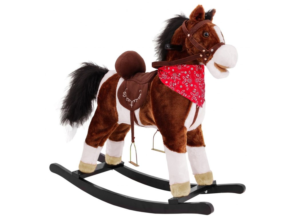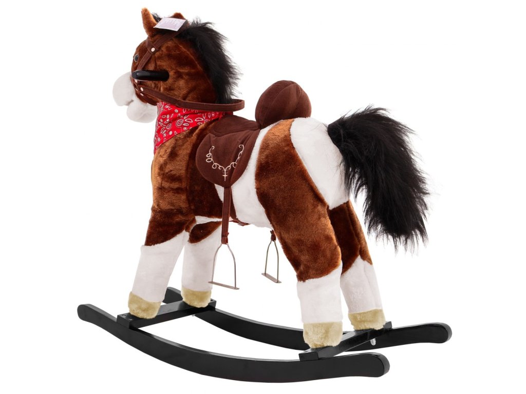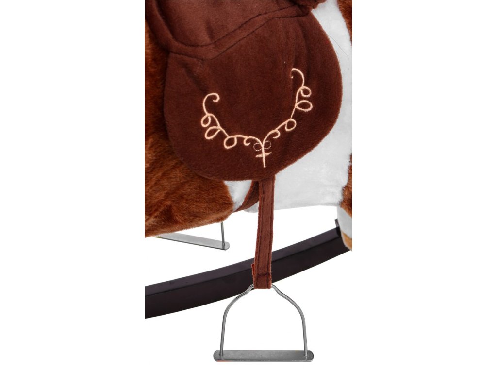 | The horse is made of soft plush. It has a saddle with stirrups and reins. On the right and left ear of the horse there are sensors that trigger sounds of neighing and gallop, move the tail and muzzle. |