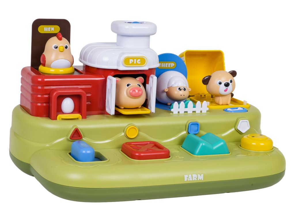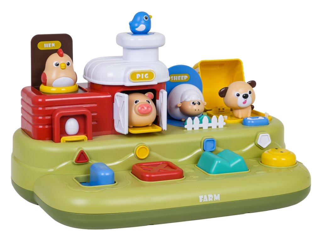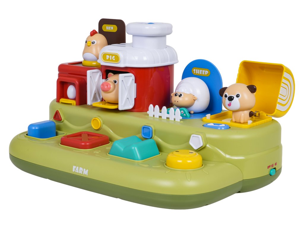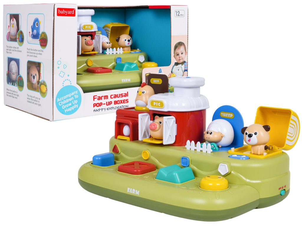 A colorful toy with pop-up animals and sound effects for children aged twelve months and up. Made of the highest quality, safe materials in vibrant colors, the base features boxes and buttons in various shapes. Sliding the blue button to the right reveals a chicken, pressing the red button opens a door, and a pig pops out. Pressing the green button reveals a sheep, and turning the yellow button reveals a dog. Above the buttons are buttons that activate various sounds, melodies, and animal sounds. The toy is powered by 3 x AA 1.5V batteries (batteries not included).