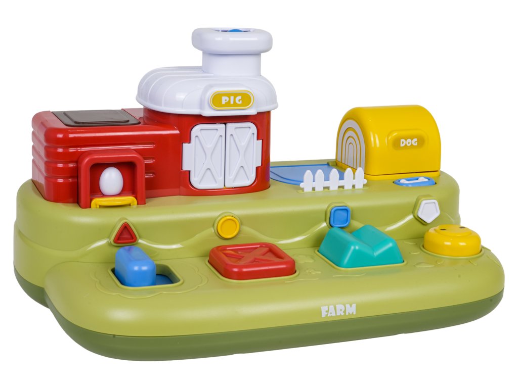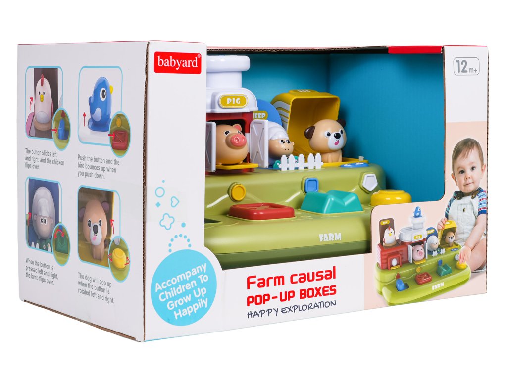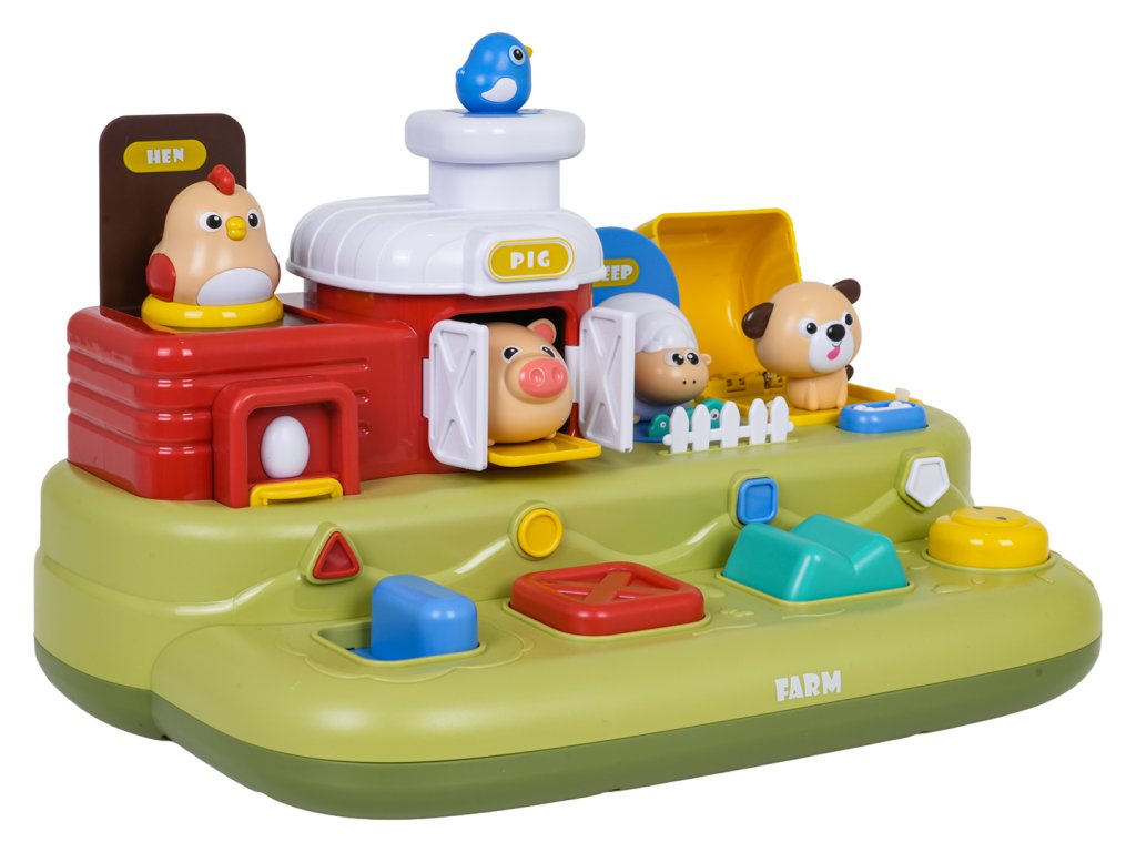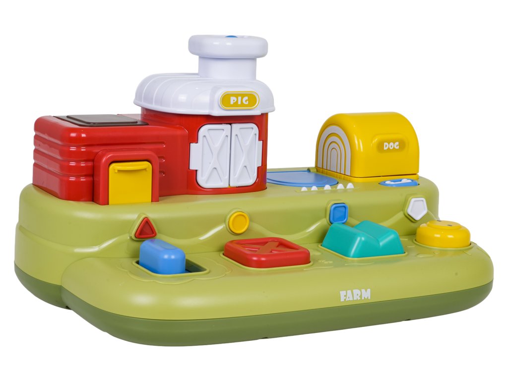 A colorful toy with pop-up animals and sound effects for children aged twelve months and up. Made of the highest quality, safe materials in vibrant colors, the base features boxes and buttons in various shapes. Sliding the blue button to the right reveals a chicken, pressing the red button opens a door, and a pig pops out. Pressing the green button reveals a sheep, and turning the yellow button reveals a dog. Above the buttons are buttons that activate various sounds, melodies, and animal sounds. The toy is powered by 3 x AA 1.5V batteries (batteries not included).
