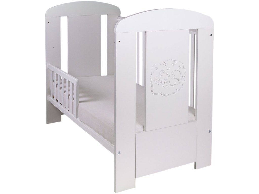 Dětská postýlka TAPCZANIK MIŚ WHITE vyrobená z laminované dřevotřísky a borovicového dřeva, se 3 úrovněmi nastavení matrace. Gravírovaná grafika malovaná třpytkamiVERZE: