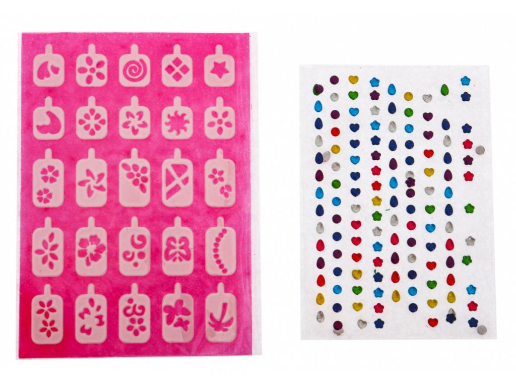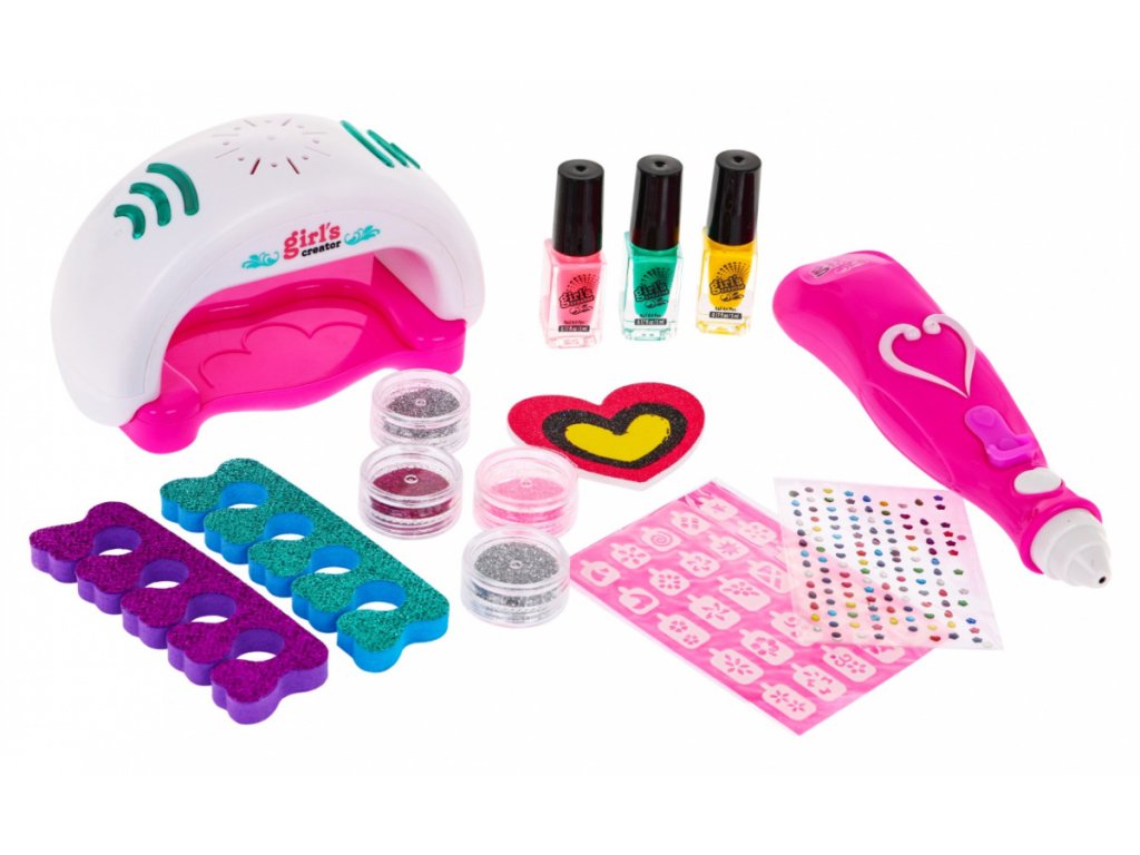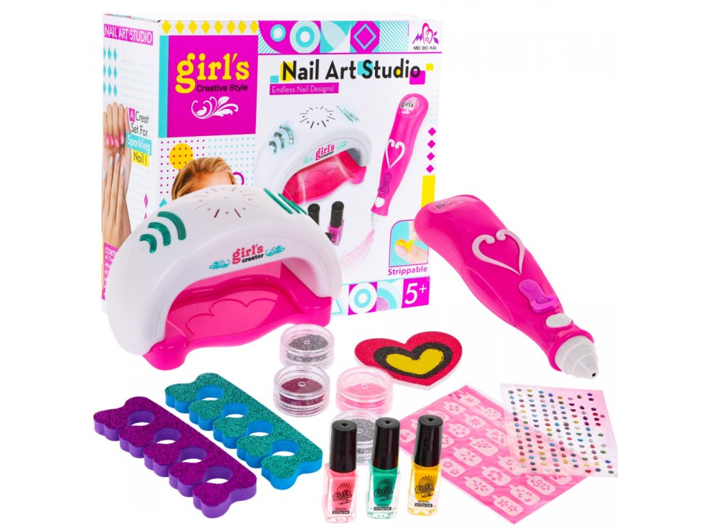 | - dryer, - glitter machine, - 2 x nail separators, - a heart-shaped nail file, - 3 x nail polish, - 25 x nail applications, - brilliants to stick on nails, - 4 x glitter. |
