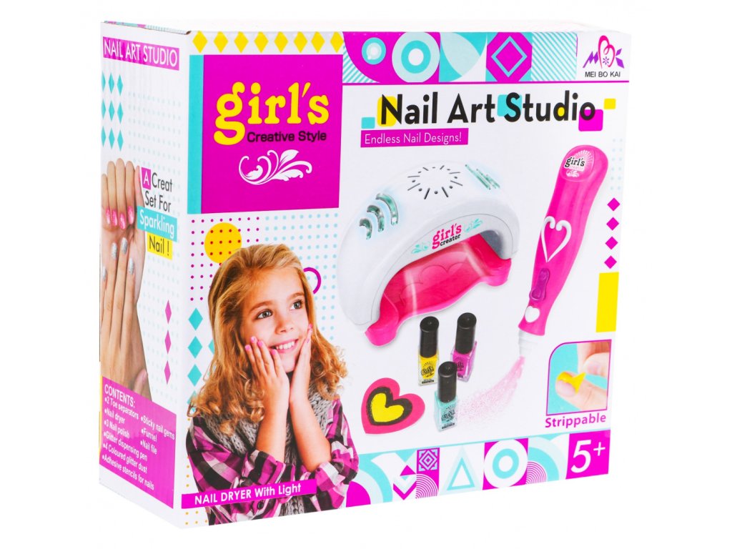 | The set includes everything necessary to take care of your nails: varnishes, file, separators, glitter, nail applications and a glitter machine and a nail dryer. The dryer is powered by 2 x AAA batteries (not included), the glitter machine is powered by 2 x AAA batteries (not included). The set is made of safe materials that are not toxic to the environment. The varnish comes off the nail surface completely, it can be removed quickly and safely. Painted nails can be covered with glitter thanks to the glitter sprayer, and then dried under a dryer that really dries the nails. The set is intended for children from 5 years of age. Play develops manual skills, stimulates creativity and trains patience. |