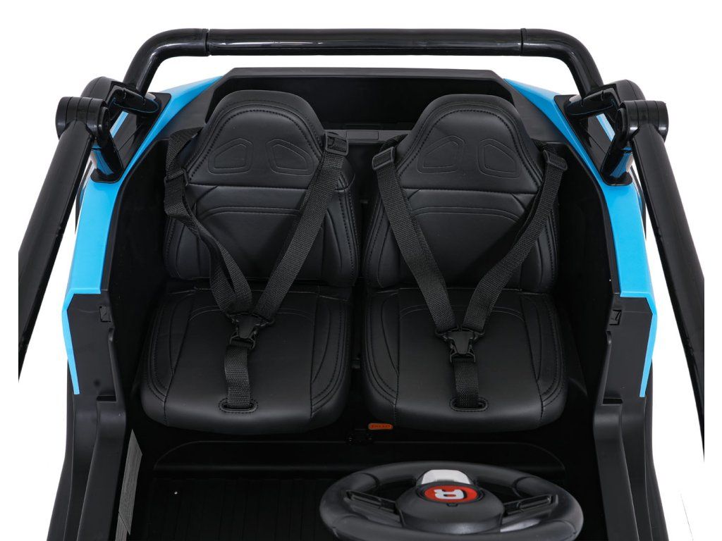 Důležité detaily jako otevírací dveře s bezpečnostním zámkem, pohodlná sedadla z černé ekologické kůže a bezpečnostní pásy přispívají k celkovému komfortu a bezpečnosti. S nosností až 35 kg a rozměry 147 cm na délku, 86 cm na šířku a 77 cm na výšku, je buggy dostatečně prostorná pro dvě děti. Vysoká světlá výška 21 cm zajišťuje, že si děti mohou užívat jízdu i na nerovném terénu.