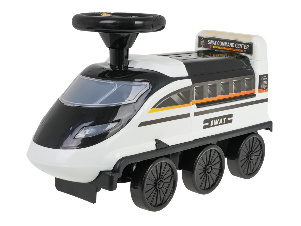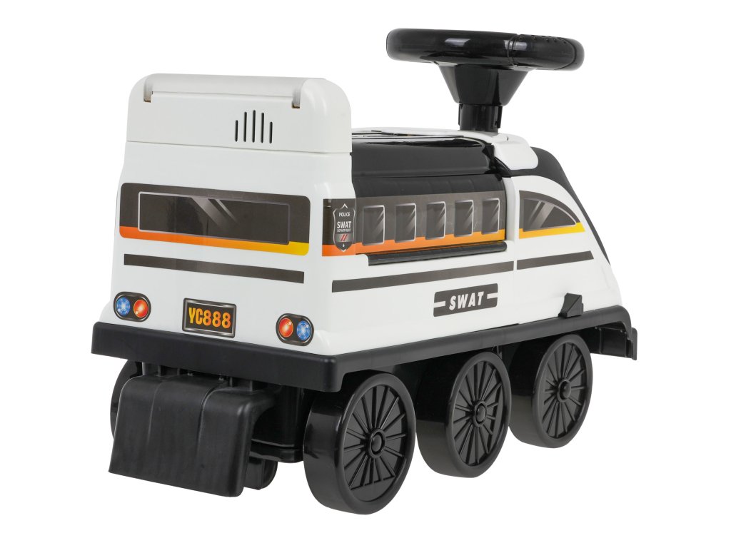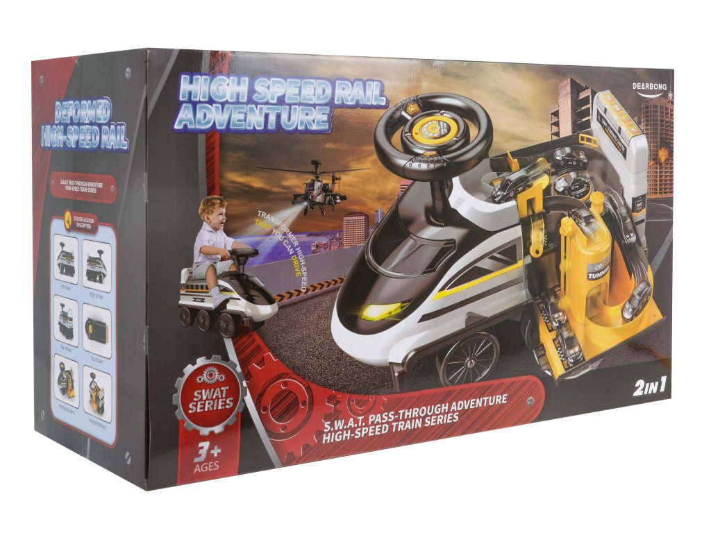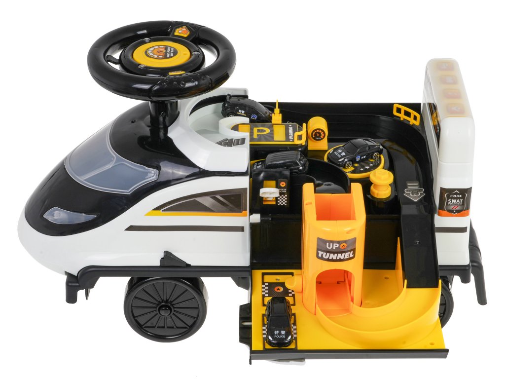 An interactive ride-on locomotive with a police parking lot and sound and light effects is a proposition for children from 3 years of age. The toy is made of high-quality, durable and non-toxic plastic. The locomotive has 6 wheels, including two front swivel wheels. Under the seat there is a foldable police parking lot with slides, a movable elevator, an opening barrier, a lift and a rotating wheel. All moving elements are controlled manually. There is also a storage room for children's treasures under the parking lot. There is also an opening front window at the front of the locomotive with free space for various small items. The sides of the locomotive are equipped with retractable footrests for children. The toy is powered by 2 x 1.5V AA batteries - steering wheel and 2 x 1.5V AA batteries - sound panel, batteries not included. There is a button on the steering wheel that activates colorful flashing lights. At the back of the locomotive there is a sound panel with buttons that can be pressed to hear melodies, stories and animal sounds. The teacher speaks English. The locomotive has glowing front lights. Functions: - light button on the steering wheel - flashing multi-colored lights, - a music panel at the back of the locomotive with music, stories and animal sounds, - glowing front lights, - stable structure, - 6 wheels, - movable steering wheel, - movable front wheels, - foldable parking under the seat, - movable parking elements, manually controlled - elevator, barrier, lift, rotating wheel, - storage space for small items under the parking lot and at the front of the locomotive under a glass imitating the windshield of a locomotive, - extendable footrests on the sides of the ride-on. |