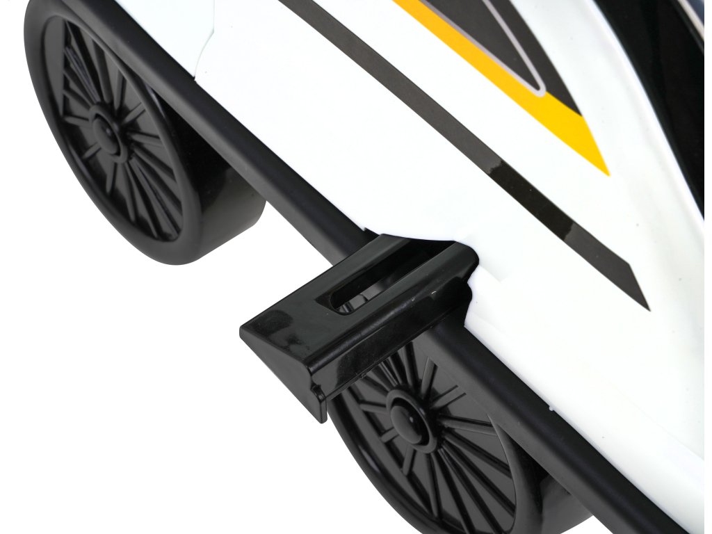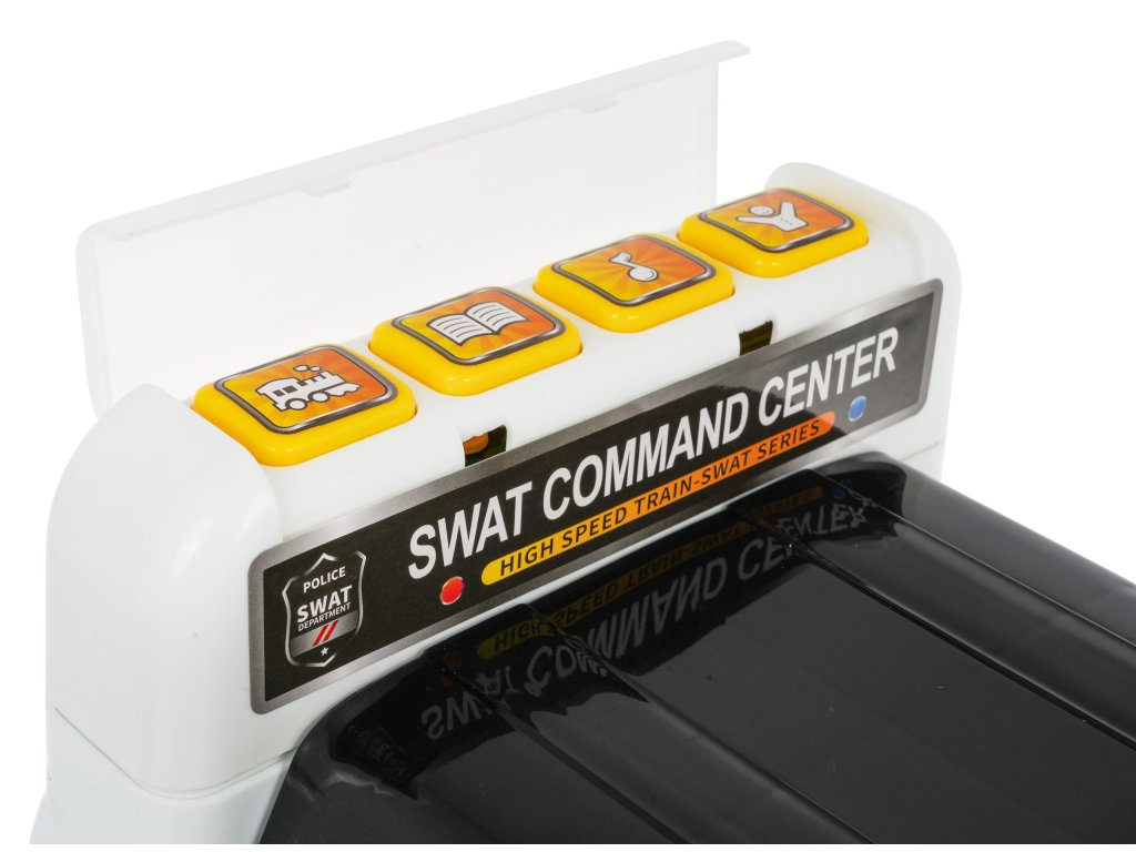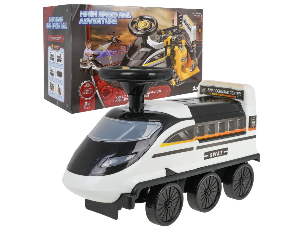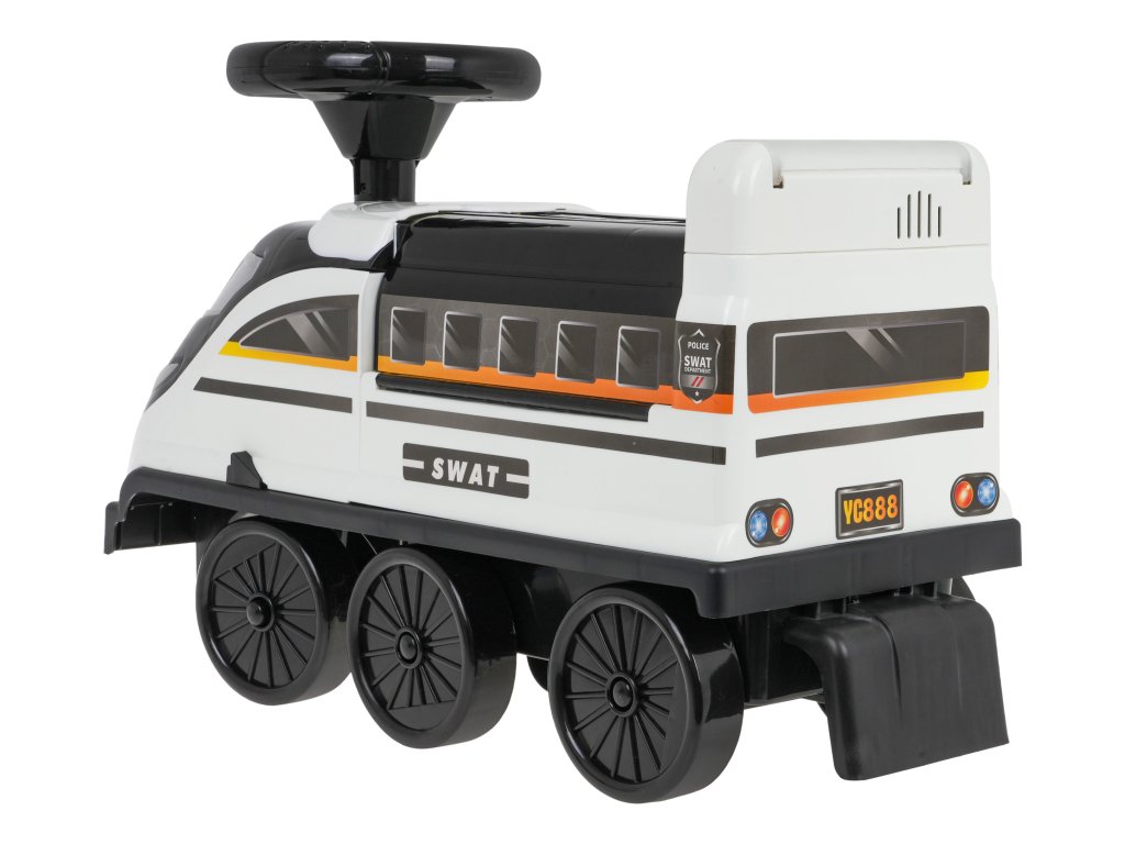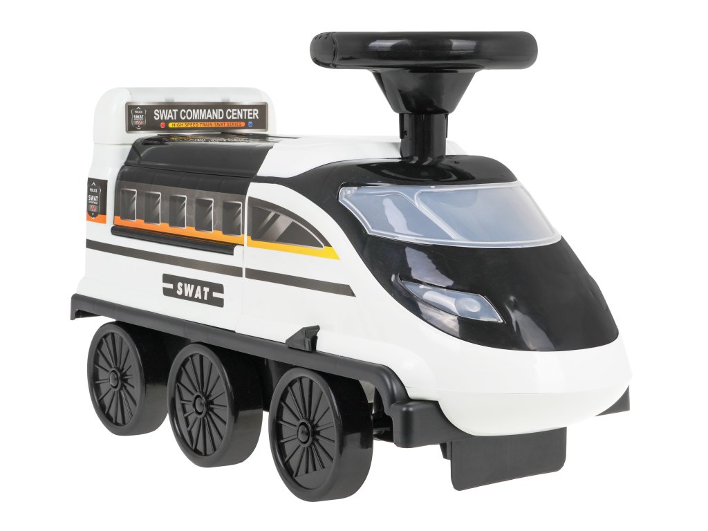 An interactive ride-on locomotive with a police parking lot and sound and light effects is a proposition for children from 3 years of age. The toy is made of high-quality, durable and non-toxic plastic. The locomotive has 6 wheels, including two front swivel wheels. Under the seat there is a foldable police parking lot with slides, a movable elevator, an opening barrier, a lift and a rotating wheel. All moving elements are controlled manually. There is also a storage room for children's treasures under the parking lot. There is also an opening front window at the front of the locomotive with free space for various small items. The sides of the locomotive are equipped with retractable footrests for children. The toy is powered by 2 x 1.5V AA batteries - steering wheel and 2 x 1.5V AA batteries - sound panel, batteries not included. There is a button on the steering wheel that activates colorful flashing lights. At the back of the locomotive there is a sound panel with buttons that can be pressed to hear melodies, stories and animal sounds. The teacher speaks English. The locomotive has glowing front lights. Functions: - light button on the steering wheel - flashing multi-colored lights, - a music panel at the back of the locomotive with music, stories and animal sounds, - glowing front lights, - stable structure, - 6 wheels, - movable steering wheel, - movable front wheels, - foldable parking under the seat, - movable parking elements, manually controlled - elevator, barrier, lift, rotating wheel, - storage space for small items under the parking lot and at the front of the locomotive under a glass imitating the windshield of a locomotive, - extendable footrests on the sides of the ride-on. |