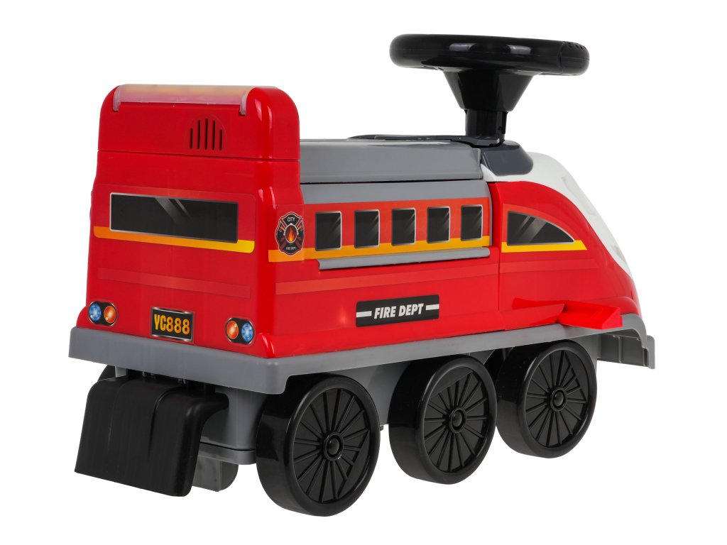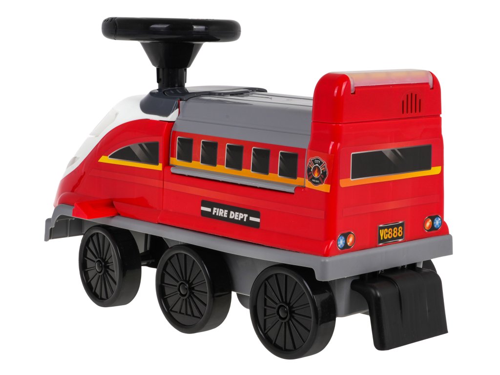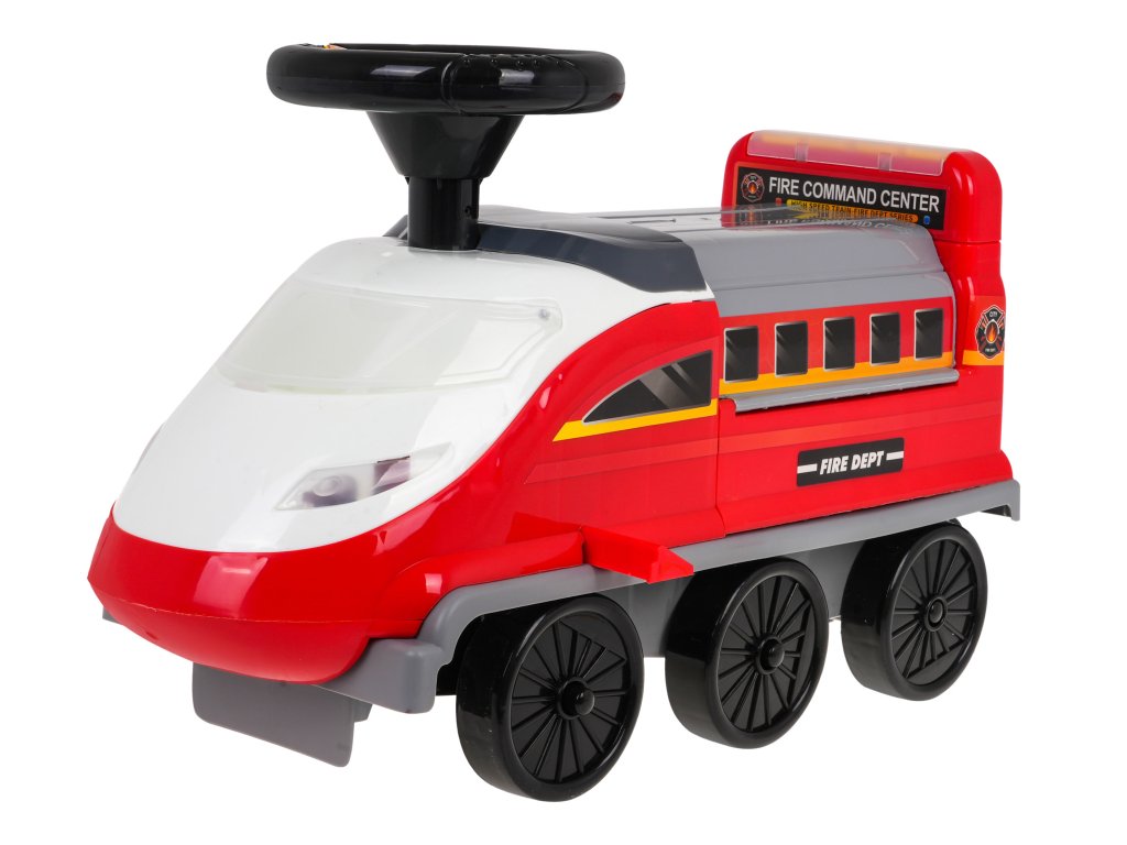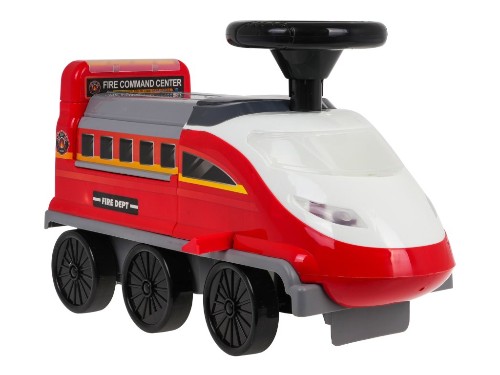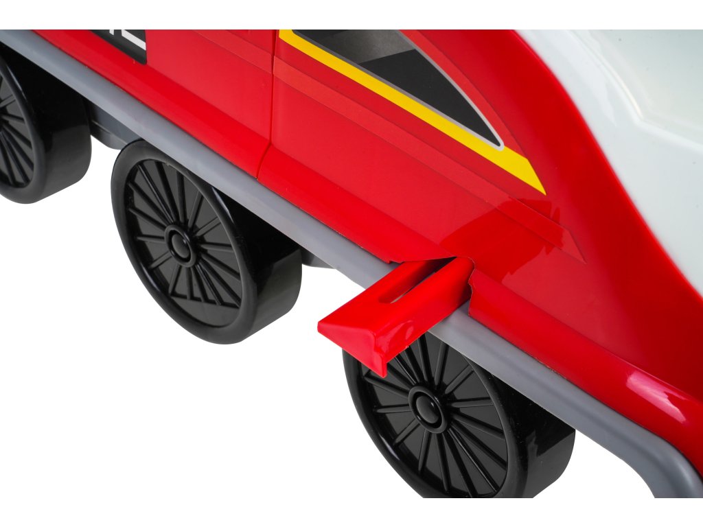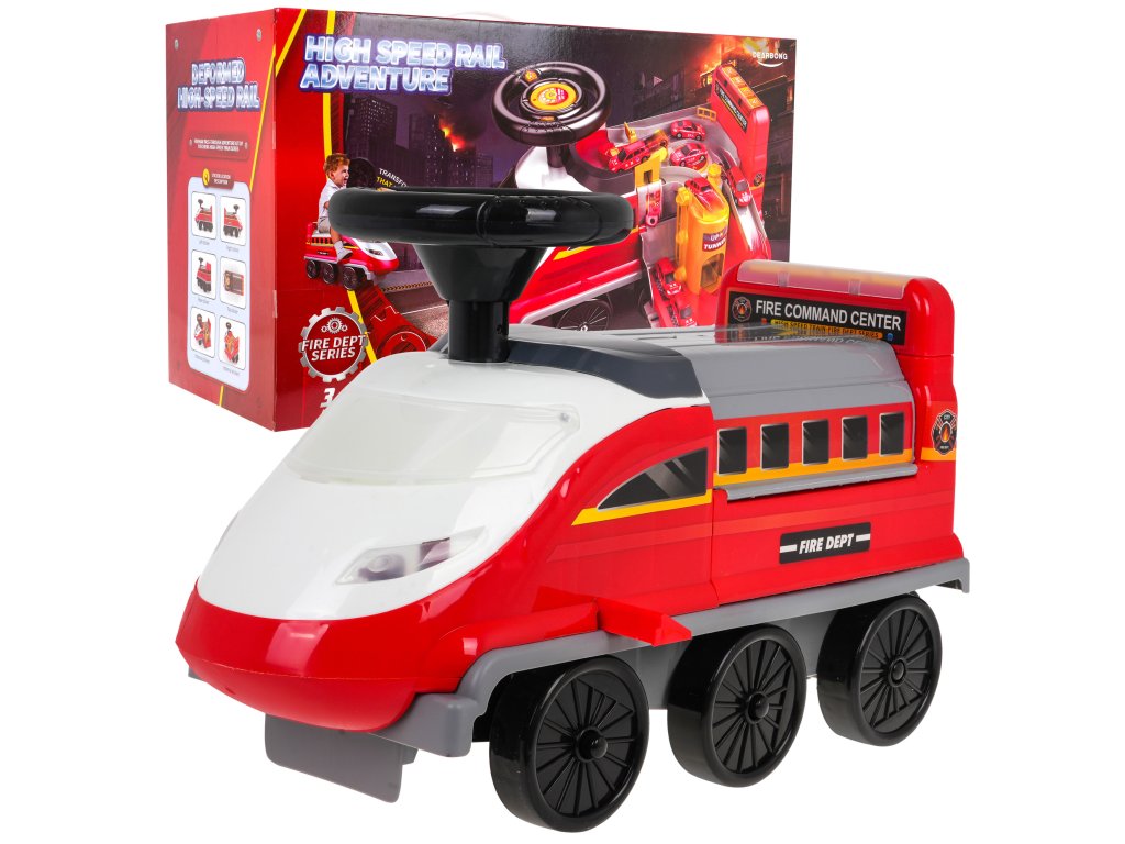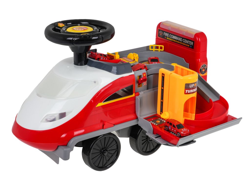 An interactive ride-on locomotive with a fire brigade parking lot and sound and light effects is a proposition for children from 3 years of age. The toy is made of high-quality, durable and non-toxic plastic. The locomotive has 6 wheels, including two front swivel wheels. Under the seat there is a foldable police parking lot with slides, a movable elevator, an opening barrier, a lift and a rotating wheel. All moving elements are controlled manually. There is also a storage room for children's treasures under the parking lot. There is also an opening front window at the front of the locomotive with free space for various small items. The sides of the locomotive are equipped with retractable footrests for children. The toy is powered by 2 x 1.5V AA batteries - steering wheel and 2 x 1.5V AA batteries - sound panel, batteries not included. There is a button on the steering wheel that activates colorful flashing lights. At the back of the locomotive there is a sound panel with buttons that can be pressed to hear melodies, stories and animal sounds. The teacher speaks English. The locomotive has glowing front lights. Functions: - light button on the steering wheel - flashing multi-colored lights, - a music panel at the back of the locomotive with music, stories and animal sounds, - glowing front lights, - stable structure, - 6 wheels, - movable steering wheel, - movable front wheels, - foldable parking under the seat, - movable parking elements, manually controlled - elevator, barrier, lift, rotating wheel, - storage space for small items under the parking lot and at the front of the locomotive under a glass imitating the windshield of a locomotive, - extendable footrests on the sides of the ride-on. |