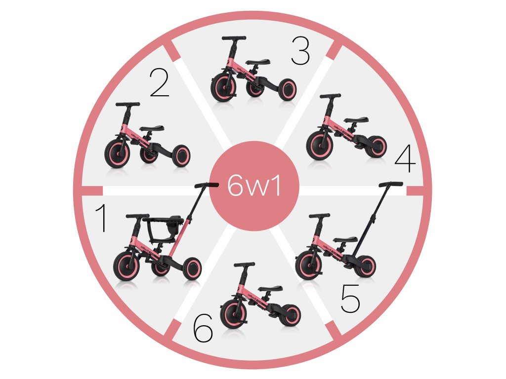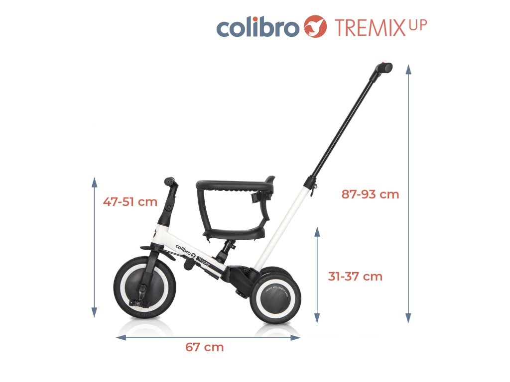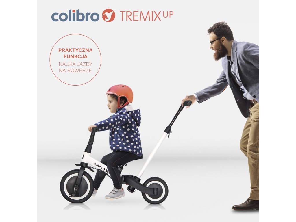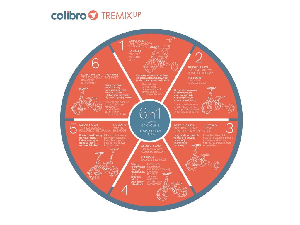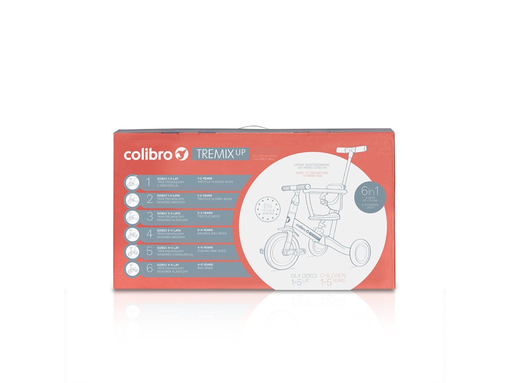 ROWEREK DZIECIĘCY 6 W 1 TREMIX UP MARKI COLIBRO TREMIX UP jest rowerkiem dziecięcym 6 w 1. Dzięki niezwykle prostemu opatentowanemu systemowi zmiany funkcji rowerka, TREMIX UP może być wykorzystywany na 6 różnych sposobów w zależności od wieku dziecka i jego umiejętności. Przeznaczony jest dla dzieci w wieku do 1 do 5 lat. To innowacyjne rozwiązanie sprawia, że rowerek rośnie razem z dzieckiem jednocześnie ułatwiając mu naukę jazdy na rowerze. Dzięki wysokiej klasy gumowym oponom rowerek dobrze trzyma się nawierzchni zarówno jako wersja trójkołowa jak i dwukołowa. W zależności od wieku swojego dziecka rowerek TREMIX możesz używać w jednej z poniższych konfiguracji: Wózek spacerowy – dla dzieci w wieku od 1 do 2 lat. W tej konfiguracji rowerek zastępuje wózek spacerowy. Siedzisko posiada oparcie wraz z pasami bezpieczeństwa i obręczą zabezpieczającą dziecko. W tylnej części rowerka zamontowana jest prowadnica (popychacz) z 3-stopniową regulacją wysokości, dzięki której rodzic może wygodnie pchać rowerek i nim manewrować. W tym czasie nóżki dziecka wygodnie spoczywają na pedałach zamontowanych pod ramą rowerka tworzących podnóżek. Jeździk trójkołowy – dla dzieci w wieku od 1 do 2 lat. W tej konfiguracji, jeździk ma zdemontowane pedały , oparcie, obręcz zabezpieczającą i prowadnicę (popychacz), a tylne koła są rozstawione. Maluszek wygodnie siedzi na nisko ustawionym siedzisku i powoli odpycha się nóżkami. Rowerek trójkołowy – dla dzieci w wieku od 2 do 3 lat. W tej konfiguracji rowerek ma zamontowane pedały i rozstawione tylne koła. Oparcie, obręcz zabezpieczająca i prowadnica (popychacz) są zdemontowane. Siedzisko dostosowujemy do wzrostu dziecka tak, żeby bez problemu sięgało do pedałów z lekko ugiętymi nóżkami. Rowerek trójkołowy jest bezpieczny i uczy płynnego pedałowania. Rowerek biegowy – dla dzieci w wieku od 3 do 4 lat. Dzięki innowacyjnemu opatentowanemu systemowi, wciskając zaledwie 3 przyciski i nie demontując żadnych elementów, przekształcisz rowerek trójkołowy w praktyczny edukacyjny rowerek biegowy. Wystarczy połączyć tylne koła w jedno stabilne podwójne koła i zdemontować pedały. Pedały demontujemy wciskając zaledwie jeden przycisk i nie są do tego wymagane żadne narzędzia. Rowerek biegowy uważany jest za najlepszy sposób nauki jazdy na rowerze. Twoje dziecko szybko nauczy się utrzymywać równowagę i przesiadka na normalny rowerek dwukołowy będzie już tylko formalnością. W tej konfiguracji zdemontowane są pedały, oparcie i prowadnica (popychacz). Rowerek dwukołowy z popychaczem – dla dzieci w wieku od 4 do 5 lat. Gdy dziecko uczy się samodzielnej jazdy na rowerze, ważne jest aby rodzic miał możliwość asekuracji. Dzięki popychaczowi zamontowanemu w tylne części rowerka, rodzi może podtrzymać rowerek w pozycji pionowej, gdy dziecko utraci równowagę. W tej konfiguracji pedały zamontowane są w przednim kole, tylne koła złączone, siodełko i kierownica dostosowane do wzrostu dziecka. Jest to ostatni etap nauki jazdy. Rowerek dwukołowy – dla dzieci w wieku od 4 do 5 lat. Gdy Twoje dziecko opanuje już utrzymywanie równowagi na rowerku biegowym i pedałowanie na rowerku dwukołowym z popychaczem, może już samodzielnie jeździć pod czujnym okiem rodzica. W tej konfiguracji pedały przymocowane są do przedniego koła, a sidełko i kierownica dostosowane do wzrostu dziecka, tworząc w ten sposób dwukołowy rowerek napędzany pedałami. Dzięki tej funkcji TREMIX UP może być ulubioną zabawką Twojego dziecka przez długi czas. Główne zalety rowerka 6 w 1 TREMIX UP marki Colibro: - aż 6 różnych konfiguracji pozwalających na korzystanie z rowerka przez długi czas, - prosty i niewymagający żadnych narzędzi system przekształcania rowerka i dopasowania do wieku dziecka, - gumowe opony z bieżnikiem zapewniające doskonałą przyczepność (Uważaj na podobne produkty z kołami z pianki EVA, która nie zapewnia przyczepności na mokrej i śliskiej nawierzchni!), - gumowe antypoślizgowe uchwyty kierownicy, - solidna konstrukcja, która bez problemu wytrzyma ciężar nawet 5 letniego dziecka, - regulacja wysokości siodełka i odległości kierownicy od dziecka, - prowadnica (popychacz) z 3-stopniową regulacją wysokości, - sportowa stylistyka, - idealny prezent na każdą okazję, - siodełko z odpinanym oparciem, obręczą zabezpieczającą i pasami bezpieczeństwa. Specyfikacja techniczna: Długość: 67 cm Szerokość (wersja trójkołowa): 46 cm Średnica kół (przód/tył): 22 cm/18 cm Szerokość kół: 4 cm Odległość od krawędzi siedziska do uchwytów kierownicy: 24 cm - 27 cm Odległość do krawędzi siedziska do maksymalnie oddalonych pedałów: 32 cm - 37 cm Wysokość siedziska: 31 cm – 37 cm Wysokość prowadnicy (popychacza): 84 cm – 93 cm Maksymalna waga dziecka: 25 kg Zgodność z normą: EN 71-1-2-3 Certyfikat CE – Tak Waga: 5,8 kgDoplňkové parametry