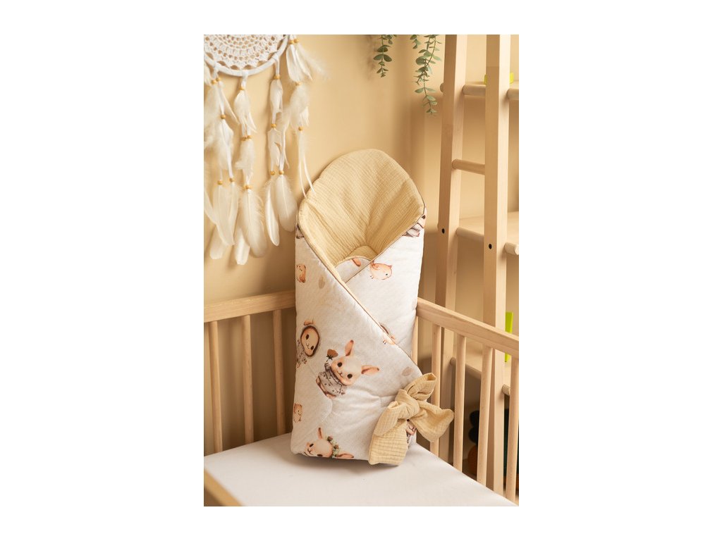 Jednostronny rożek niemowlęcy Muślin został stworzony z myślą o noworodkach i niemowlętach. Zapięcie na rzep umożliwia wygodne trzymanie dziecka podczas karmienia i usypiania. Po rozłożeniu, rożek może być z powodzeniem stosowany jako kołderka do łóżeczka czy wózka dziecięcego. Może także służyć jako mata do zabawy. Wykonany został z tkanin bawełnianych: bawełny drukowanej oraz muślinu. Wypełnienie rożka to antyalergiczna włóknina puszysta silikonowa. Wysoką jakość wykonania podkreśla estetyczna wypustka