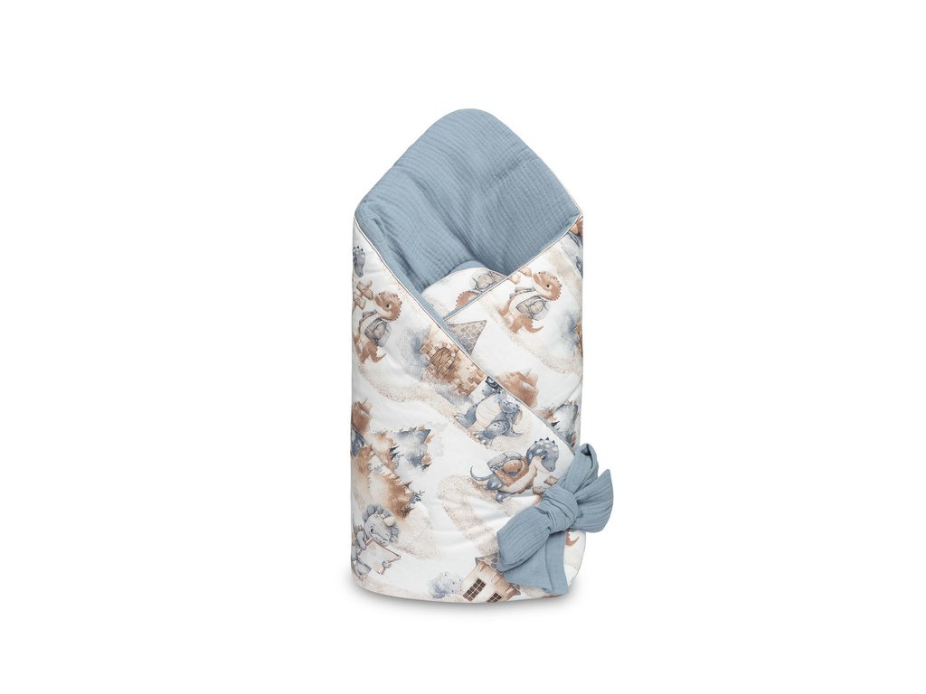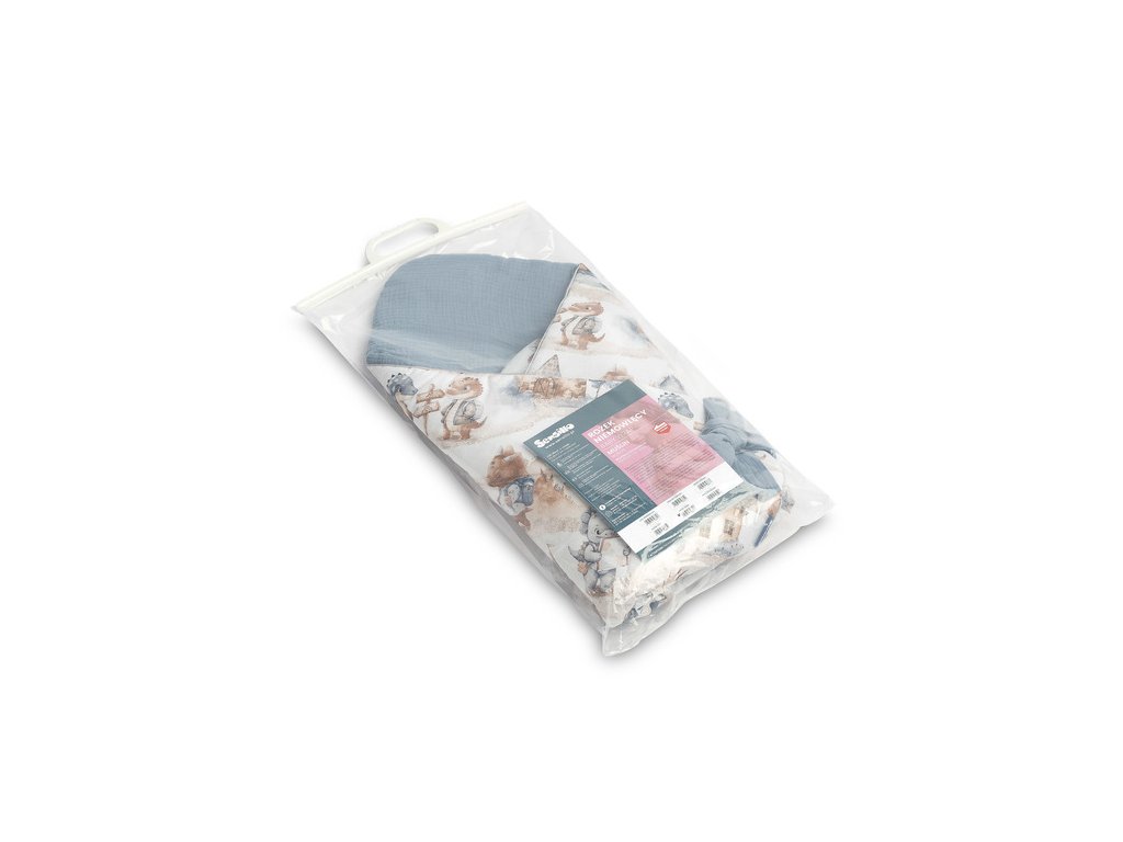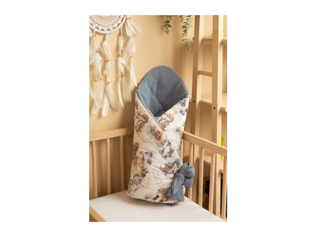 Jednostronny rożek niemowlęcy Muślin został stworzony z myślą o noworodkach i niemowlętach. Zapięcie na rzep umożliwia wygodne trzymanie dziecka podczas karmienia i usypiania. Po rozłożeniu, rożek może być z powodzeniem stosowany jako kołderka do łóżeczka czy wózka dziecięcego. Może także służyć jako mata do zabawy. Wykonany został z tkanin bawełnianych: bawełny drukowanej oraz muślinu. Wypełnienie rożka to antyalergiczna włóknina puszysta silikonowa. Wysoką jakość wykonania podkreśla estetyczna wypustka