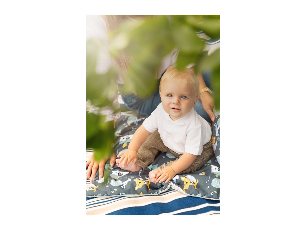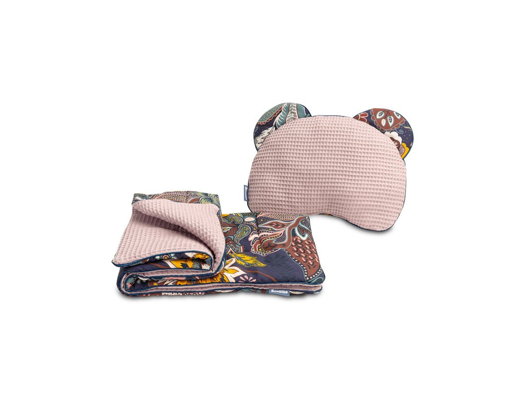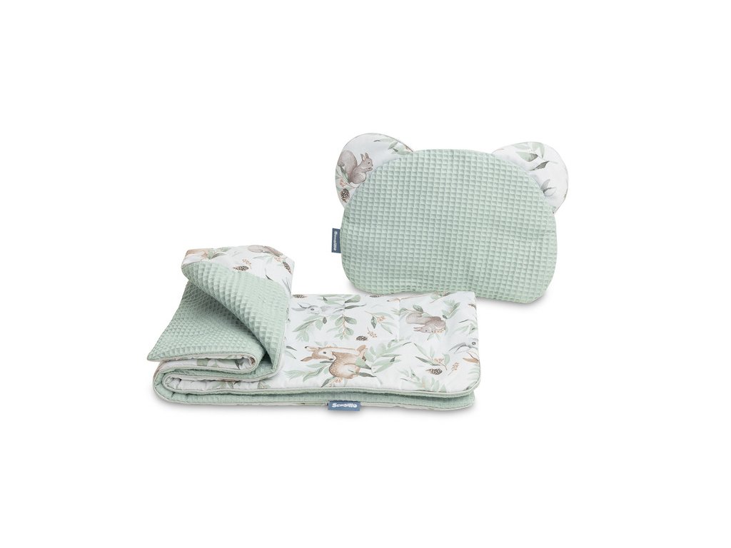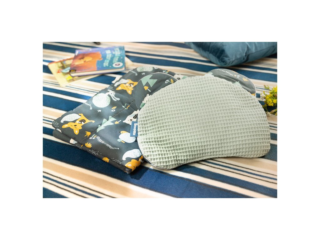 Komplet do wózka Wafel składa się z poduszki (36x28 cm) i kocyka (56x76 cm). Dzięki takim rozmiarom komplet idealnie sprawdza się w wózku, łóżeczku czy jako miękka mata dla Maluszka. W środku znajduje się antyalergiczne wypełnienie, które zapewnia odpowiednią izolację przed chłodem. Sama poduszka może służyć jako Przytulanka. Zestaw został wykonany ze 100% bawełny - z jednej strony znajduje się nadruk, a z drugiej miękka bawełna o strukturze wafla, która nadaje niepowtarzalny wygląd całemu zestawowi