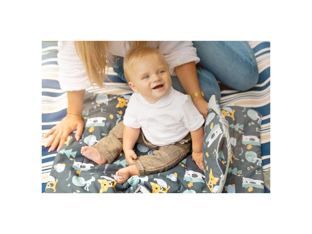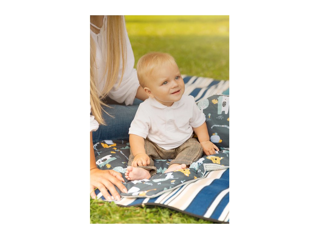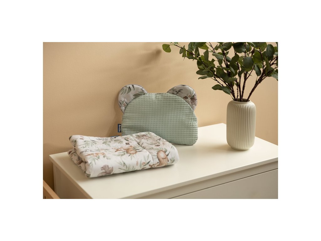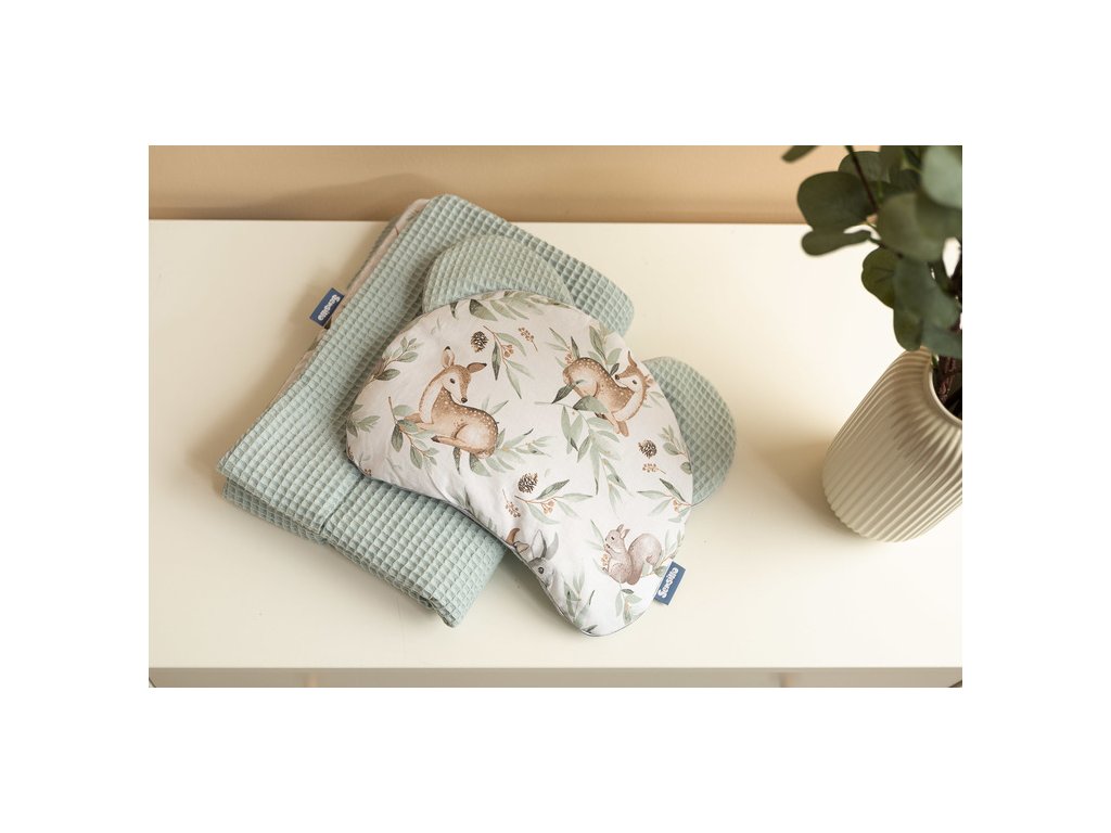 Komplet do wózka Wafel składa się z poduszki (36x28 cm) i kocyka (56x76 cm). Dzięki takim rozmiarom komplet idealnie sprawdza się w wózku, łóżeczku czy jako miękka mata dla Maluszka. W środku znajduje się antyalergiczne wypełnienie, które zapewnia odpowiednią izolację przed chłodem. Sama poduszka może służyć jako Przytulanka. Zestaw został wykonany ze 100% bawełny - z jednej strony znajduje się nadruk, a z drugiej miękka bawełna o strukturze wafla, która nadaje niepowtarzalny wygląd całemu zestawowi