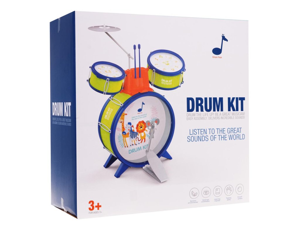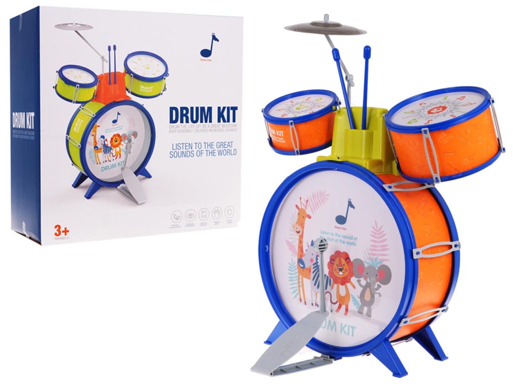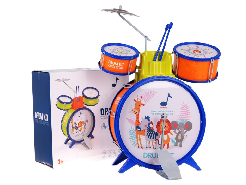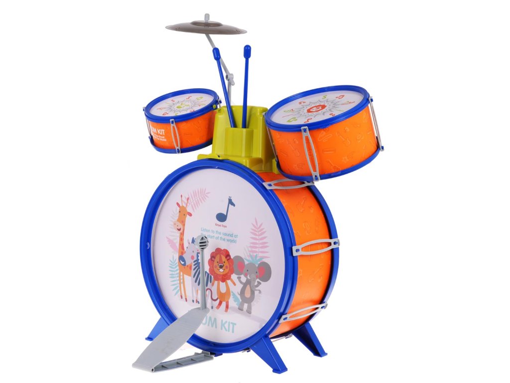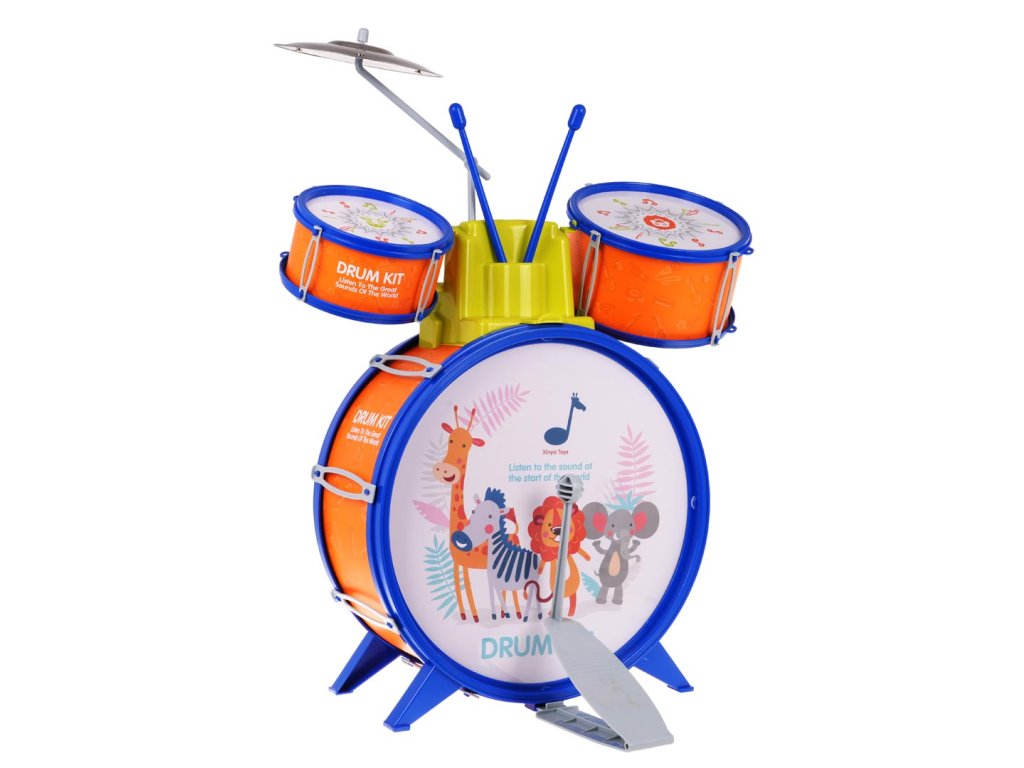 Colorful Safari drums for children from 3 years of age. The set consists of 3 drums, a plate and sticks. It is made of the best quality materials in vivid colors that attract the child's attention and encourage play. There is a drawing of animals on the large drum. The sound from the large drum is activated by hitting the foot pedal, and from the upper drums and plate, by hitting the sticks. Playing with this set develops the child's interest in music and talent, teaches a sense of rhythm and exercises hand-eye coordination.