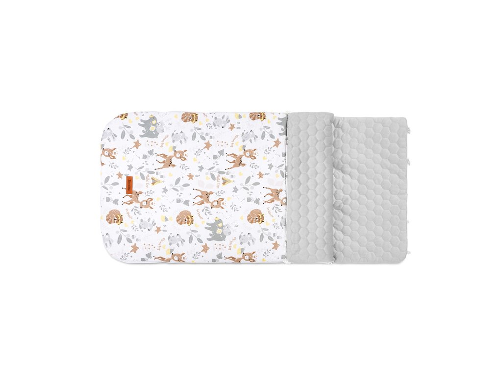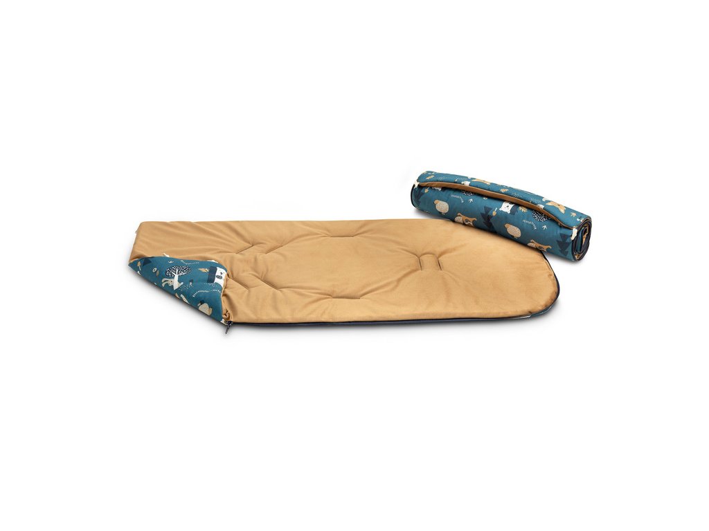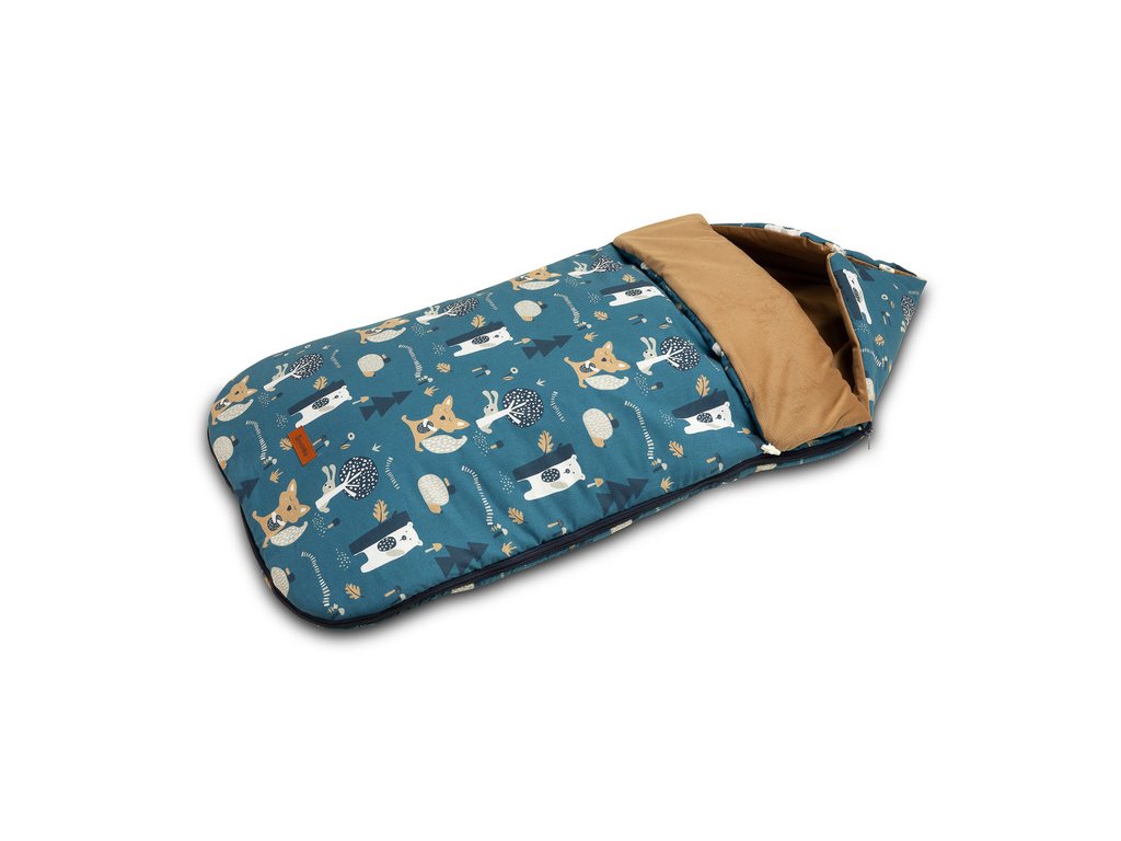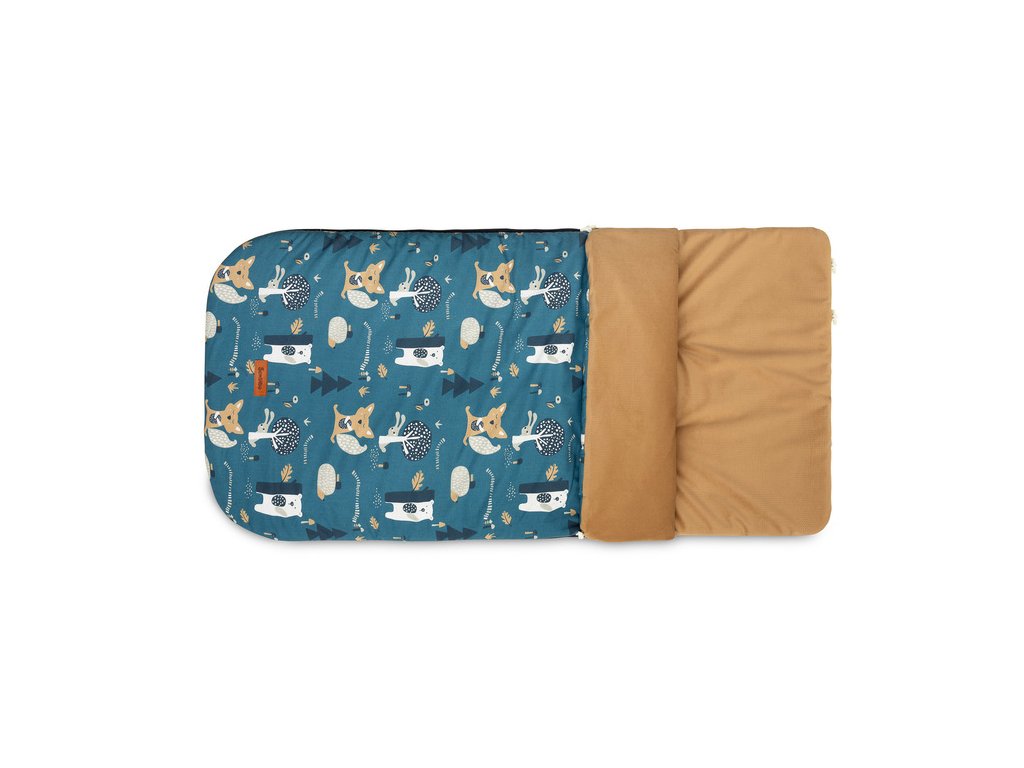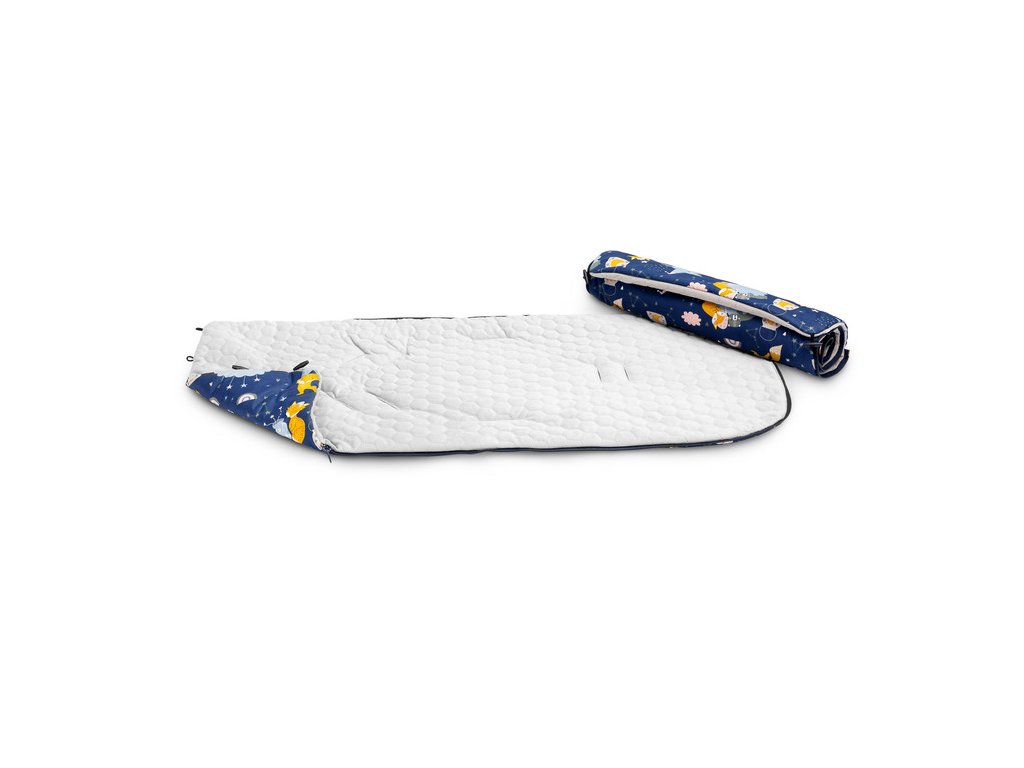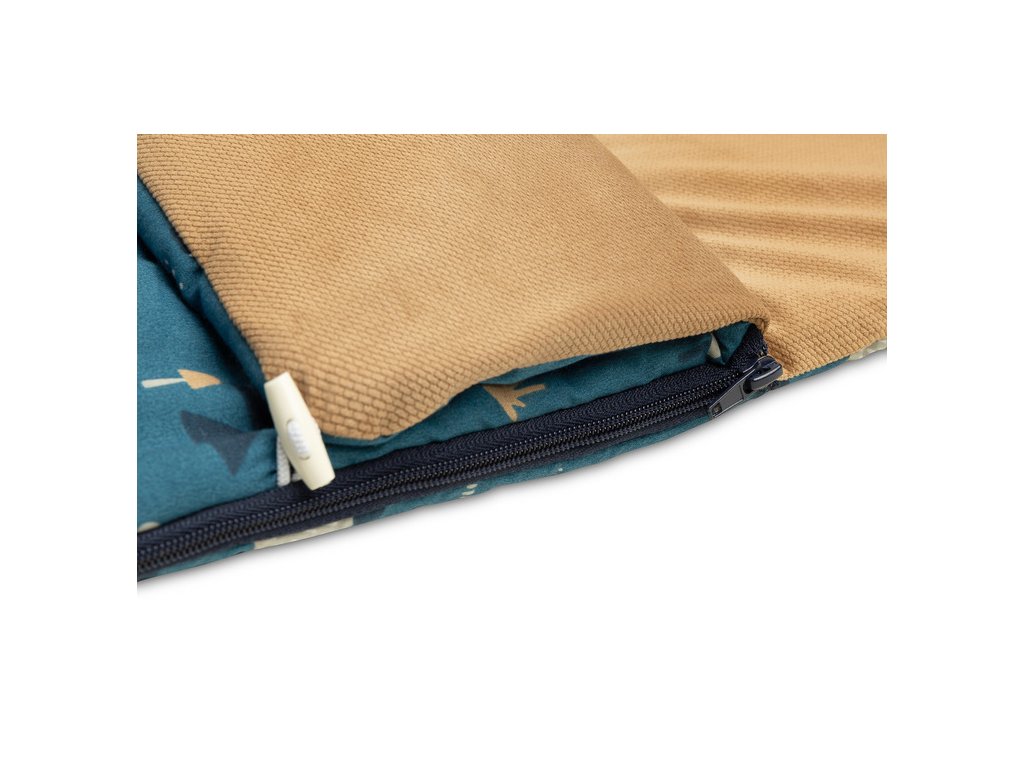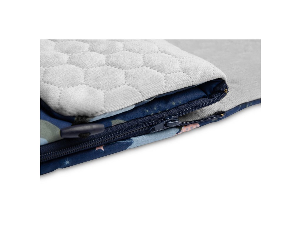 Zewnętrzna warstwa śpiworka to bawełna z pięknym wzorem. Pod spodem znajduje się warstwa ortalionu, której celem jest ochrona przed dostaniem się wody do środka oraz bardzo lekkie i cienkie wypełnienie z włókien poliestrowych, zapewniające odpowiednią temperaturę. Środek śpiworka to miękki i delikatny pikowany velvet.