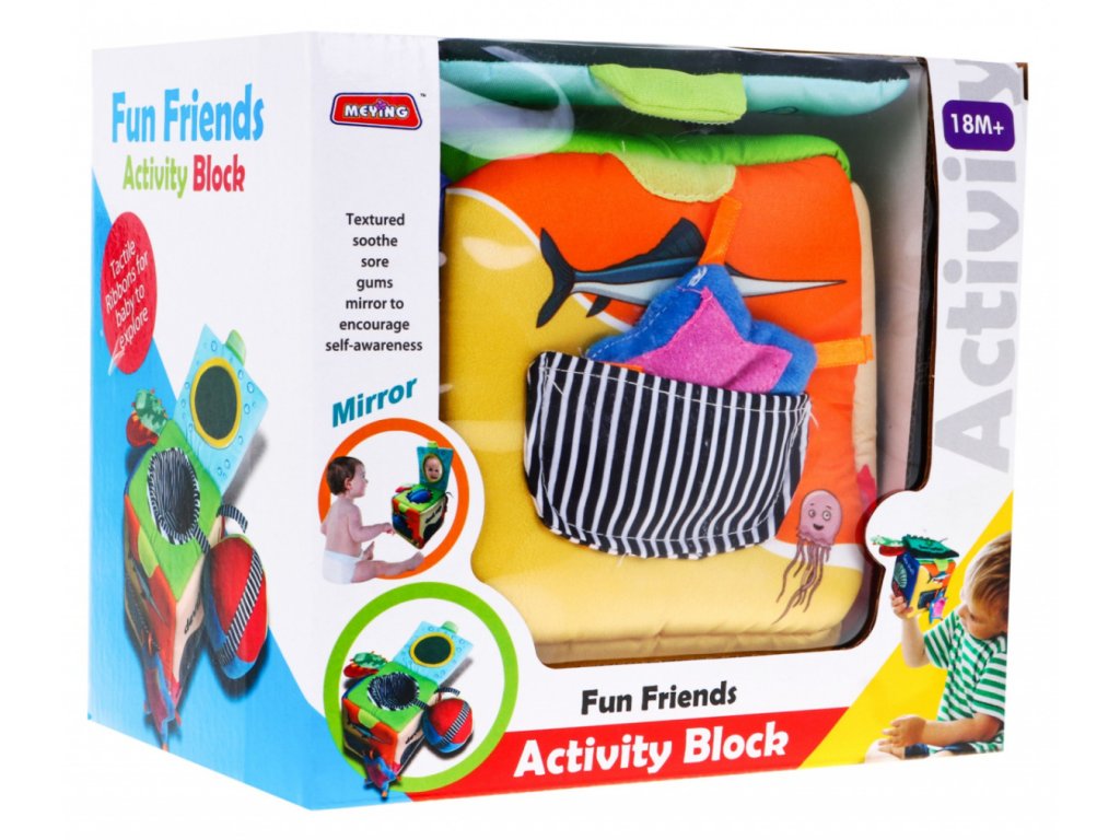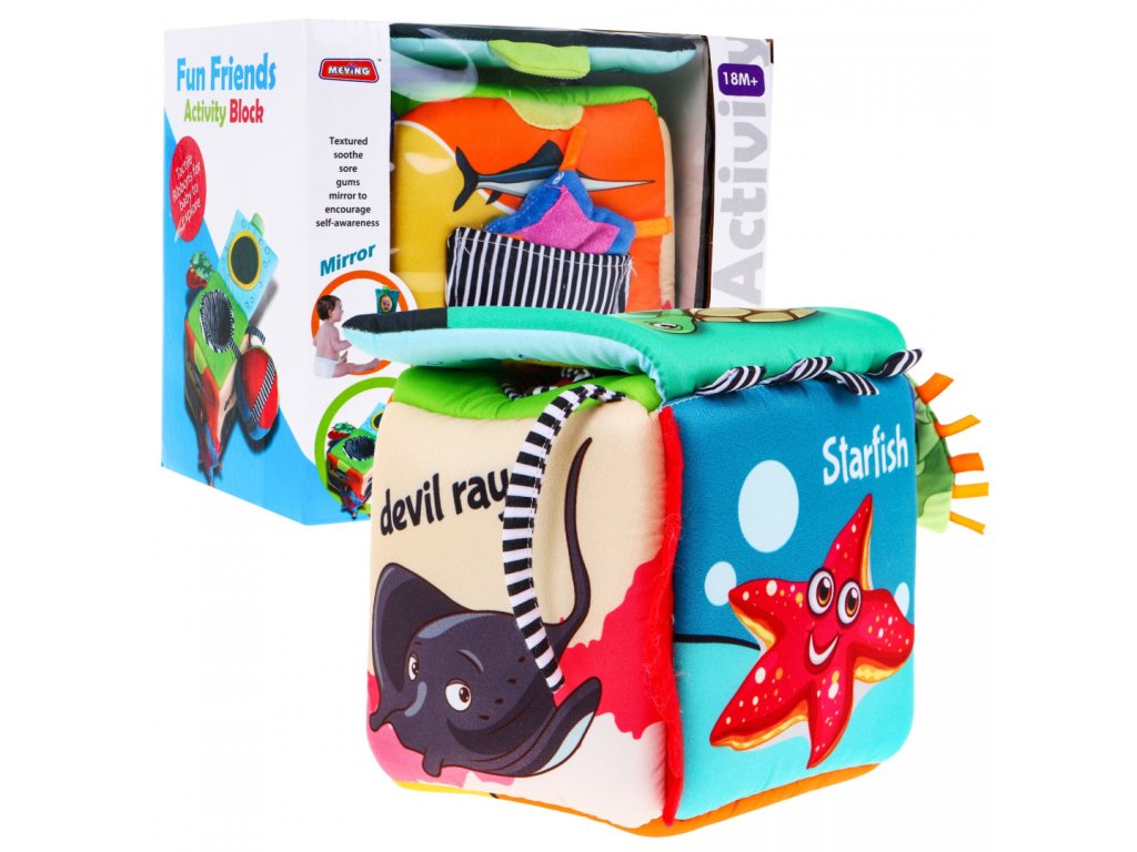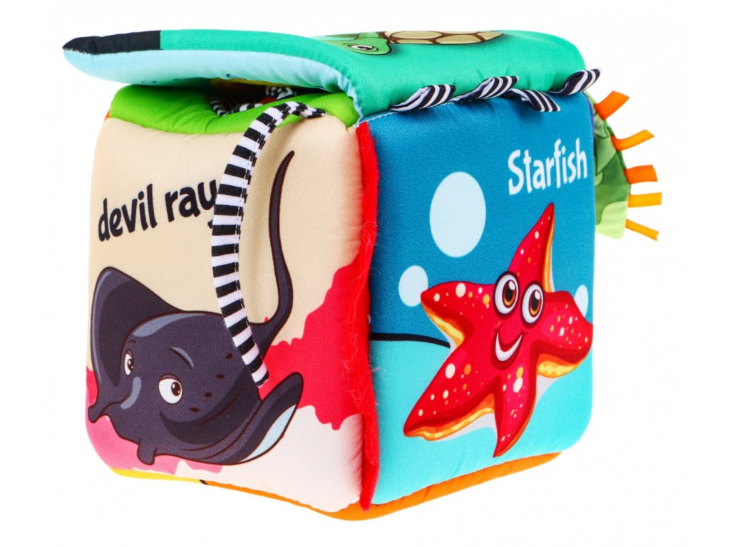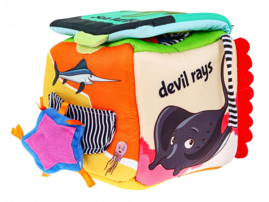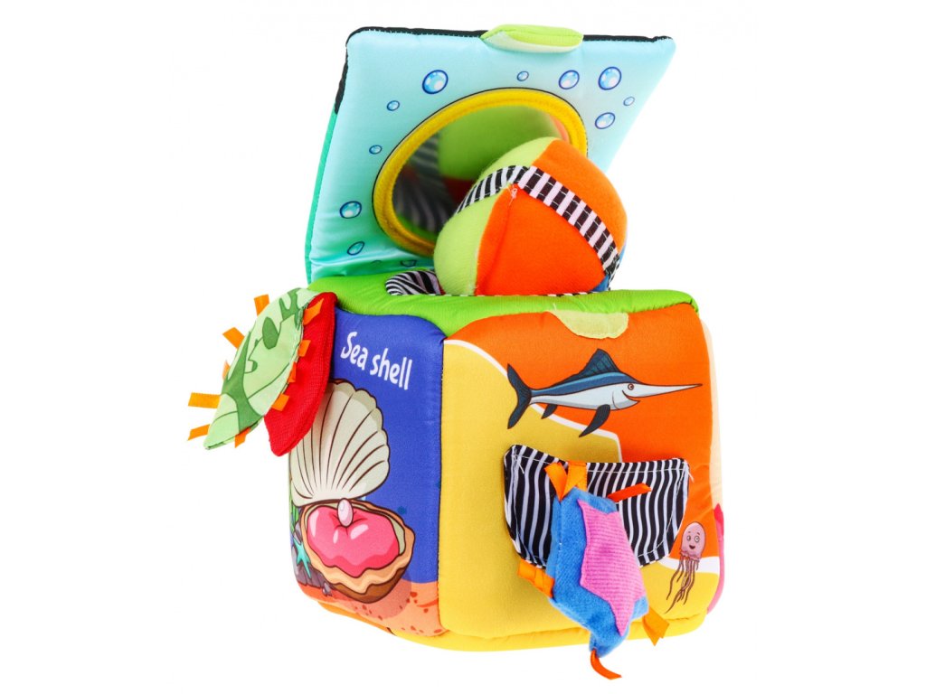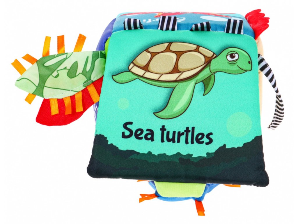 | The sensory cube is a proposal for children from 18 months of age. The toy perfectly affects all the baby's senses, provides a variety of stimuli, stimulates the brain to work, and perfectly stimulates the development of motor skills. Develops imagination, cognitive skills through shapes and a mirror. Rustling and rattling elements attract attention and facilitate learning to grasp. It positively influences the development of speech, logical thinking and eye-hand coordination. There is something different on each side of the ankle: 1. The first wall with a turtle drawing is fastened with Velcro and on the inside there is a safe mirror under which we have a colored ball in a recess. The child will try to take the ball out and hear a rattle inside the ball. 2. The second wall at the bottom is a drawing of a fish, 3. Third wall with a pocket in which there is a star with a rattle in the middle, 4. Wall four - a drawing of a stingray, 5. Wall five - a drawing of a starfish, 6. The sixth wall - a drawing of a shell, we also have two leaves, which rustle when touched. |