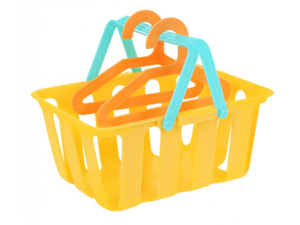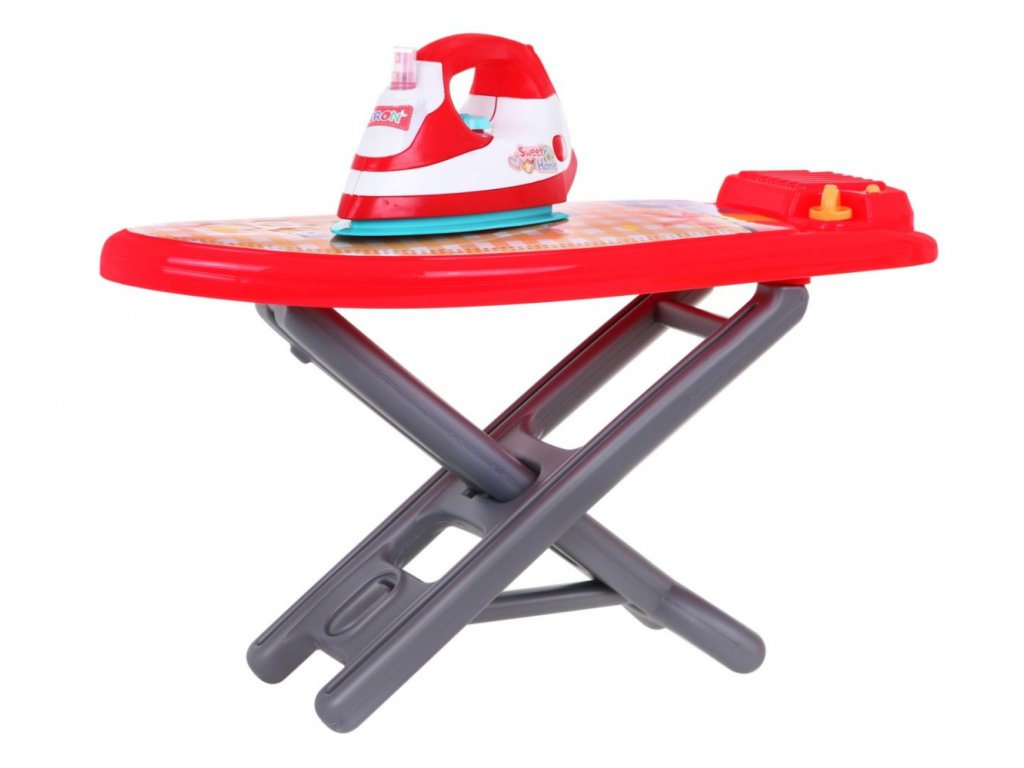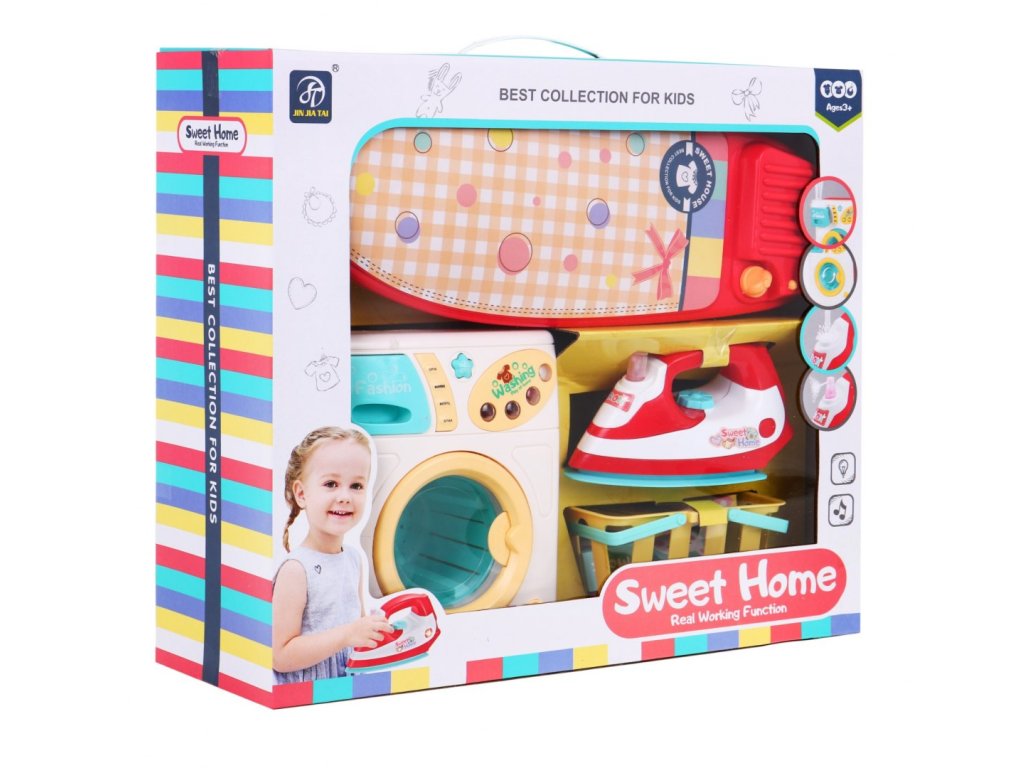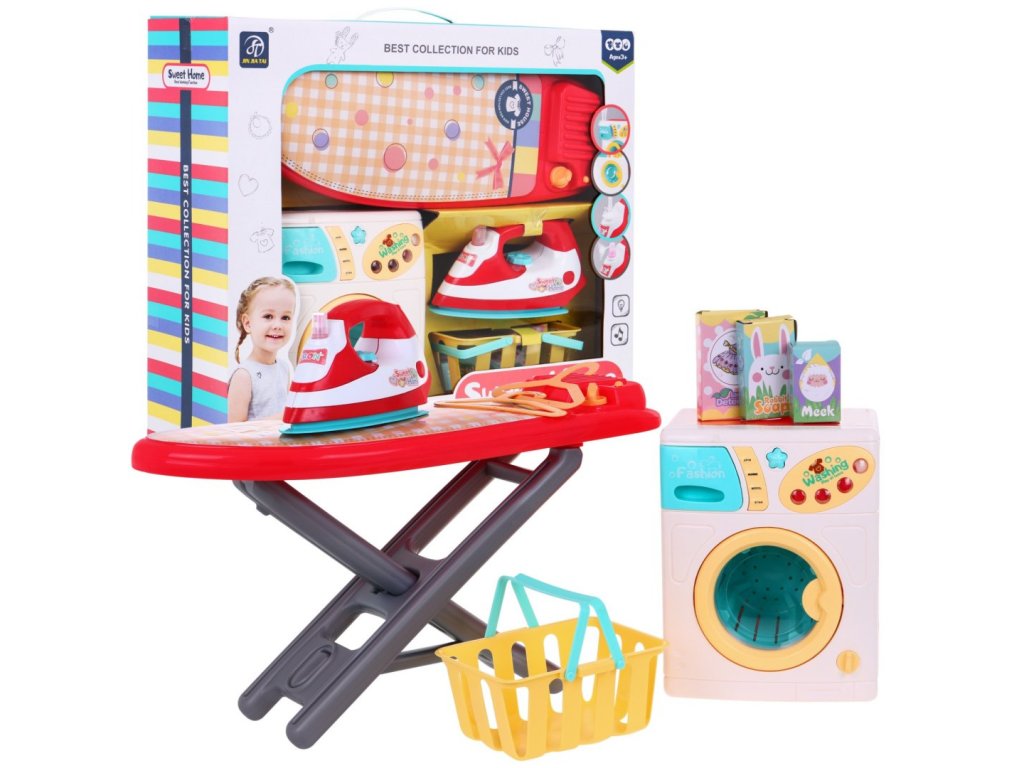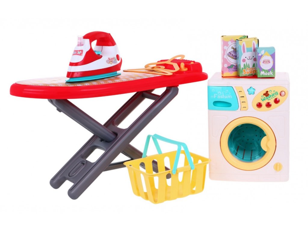 | - ironing board, - iron with washer, - a large washing machine - basket, - 2 hangers, - accessories: 3 pack of detergents (imitation) for washing (cardboard packaging), - colorful packaging - ideal for a gift. |