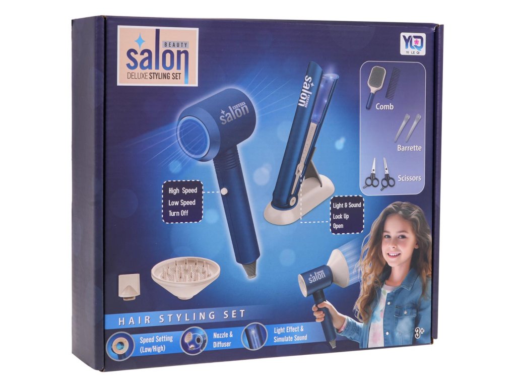 An interactive, richly equipped hairdressing set with a hair dryer with replaceable nozzles and a battery-powered hair straightener is a proposal for children from 3 years of age. The set includes a wide range of tools necessary in the work of a hairdresser, including a hair dryer, a hair straightener, scissors, a hair comb and other accessories. The hair dryer emits a stream of air. It has a two-stage regulation of the degree of airflow, and during drying it makes sounds like a real one. The straightener has light effects and sounds accompanying hair straightening. The hair dryer is powered by 3 x AAA 1.5 V batteries (not included), the straightener by 2 x AAA 1.5 V batteries (not included).